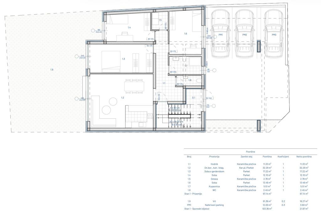 Osijek, Petefijeva, četverosoban stan S1 u prizemlju zgrade A, ukupne neto korisne površine 118,99 m², smješten u atraktivnom projektu s ukupno šest luksuznih stanova. Sastoji se od hodnika, otvorenog koncepta dnevnog boravka, kuhinje i blagavaonice (32,29 m²), ostave, veće spavaće sobe s garderobom, još dvije spavaće sobe, kupaonice i dodatnog WC-a. Ukupna zatvorena površina stana iznosi 97,14 m². Uz stan dolazi privatni vrt (91,25 m²) te jedno vanjsko natkriveno parkirno mjesto (12 m²).Opis gradnje i opreme:Građevina je projektirana kao zidana konstrukcija od blok opeke s armirano-betonskim horizontalnim i vertikalnim serklažama,Debljina nosivih zidova iznosi 25 cm,Krovna konstrukcija izvedena je s betonom za pad, PVC hidroizolacijom, zaštitnom glazurom te završnim slojem keramičkih pločica,Fasada objekta izvodi se kao kombinacija DEMIT fasade i ALUCOBOND aluminijskih kompozitnih panela ukupne debljine 15 cm,Vanjska stolarija izrađena je od aluminijskih termo profila proizvođača FEAL u antracit boji (RAL 7016), s troslojnim izolacijskim staklom,Prozori su opremljeni termoizoliranim aluminijskim roletama,Vanjske prozorske klupčice su aluminijske, dok su unutarnje izvedene u kamenu,Podne obloge u stanovima kombinacija su: porculanskih pločica 1. klase (hodnici, kuhinja, sanitarije i ostave) i višeslojnog hrastovog parketa u sobama,Sve konstrukcije i ugrađeni materijali projektirani su i odabrani s ciljem postizanja visokog standarda zvučne i toplinske izolacije, čime se osigurava ugodan i kvalitetan prostor za stanovanje,Ulaz u zgradu osiguran je videoportafonom s elektroničkom bravom i sustavom kontrole pristupa, dok je dodatnu sigurnost osigurava videonadzor ulaza u zgradu,Grijanje i topla voda putem dizalice topline zrak/voda s podnim grijanjem i termostatima. Hlađenje multi-split sustavom, ventilacija u prostorijama bez prozora. Kupaonica i WC s kvalitetnom sanitarijom i konzolnim WC školjkama.* Planirani završetak gradnje i useljenje predviđeni su za jesen 2027. godine.Izvrsna lokacija, Petefijeva ulica je mirna i tiha, a Retfala nudi sve ključne sadržaje: škole, vrtiće, trgovine, trgovačke centre, restorane i javni prijevoz. Centar grada dostupan je brzo i jednostavno, što ovu lokaciju čini idealnom za svakodnevni život.Za više informacija slobodno se javite.... Više na eurovilla.hr, ID: 212135