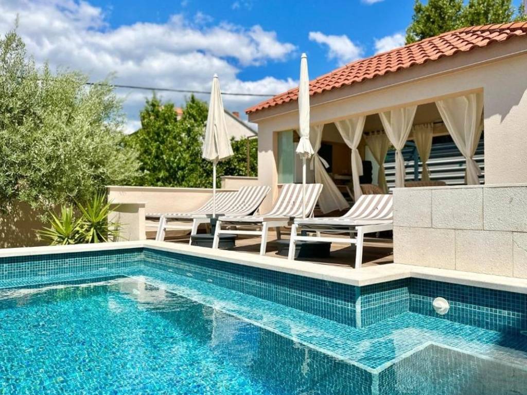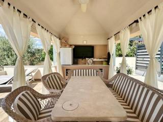 The special value of this property is given by the richly decorated outdoor space. Next to the house there is a heated swimming pool with a sunbathing area, ideal for relaxing and socializing, as well as a summer kitchen with a fireplace and a gazebo that creates the perfect ambiance for spending time outdoors. Additional amenities include a gym located on the ground floor of the building, with underfloor heating installed not only throughout the house, but also in the gym and on the outdoor terrace as part of the summer kitchen. Outside parking spaces are provided behind the building, which further increases the practicality of use. The house is being sold fully furnished and equipped, ready to move in or continue as a tourist rental.