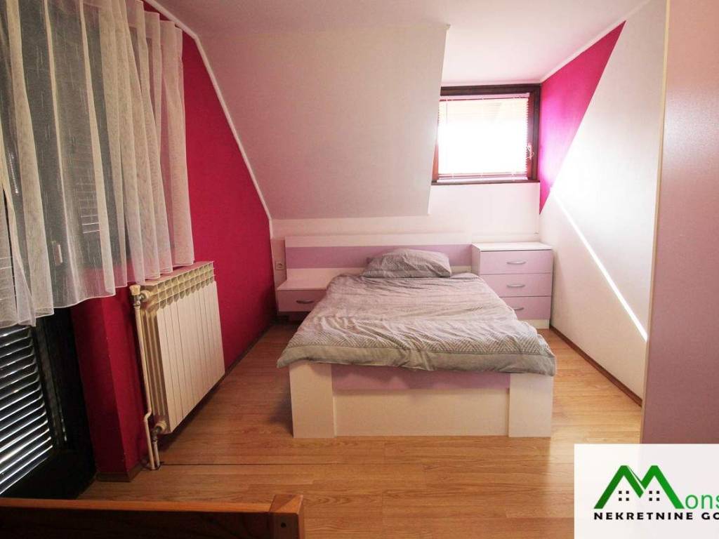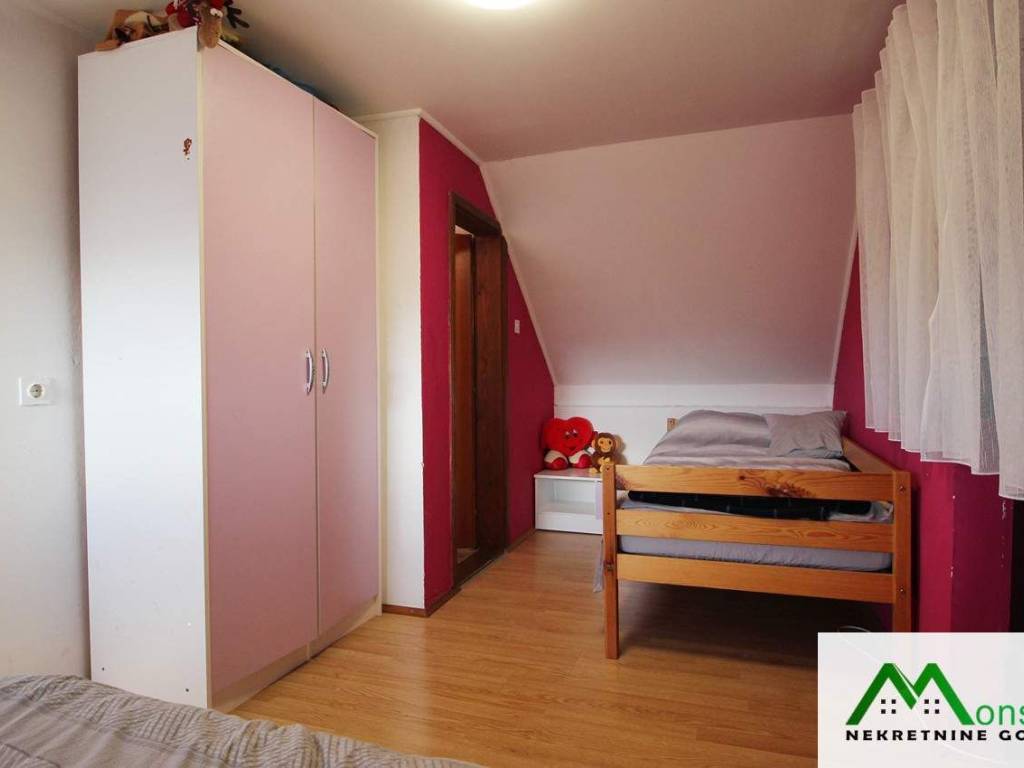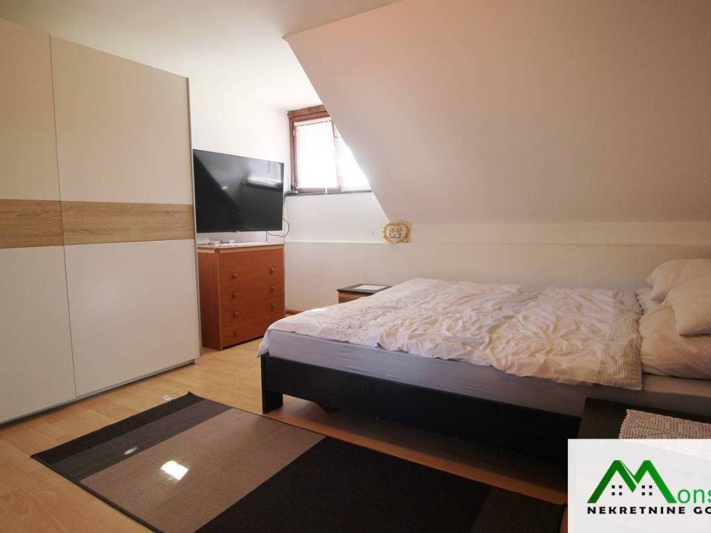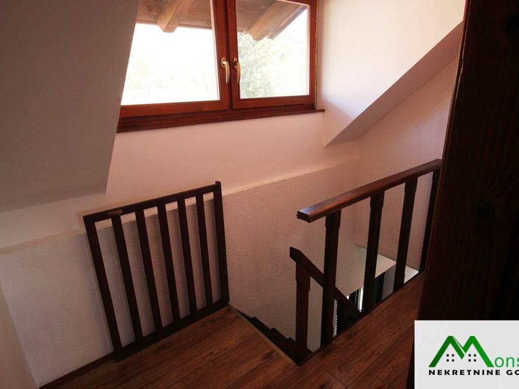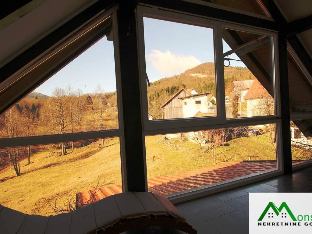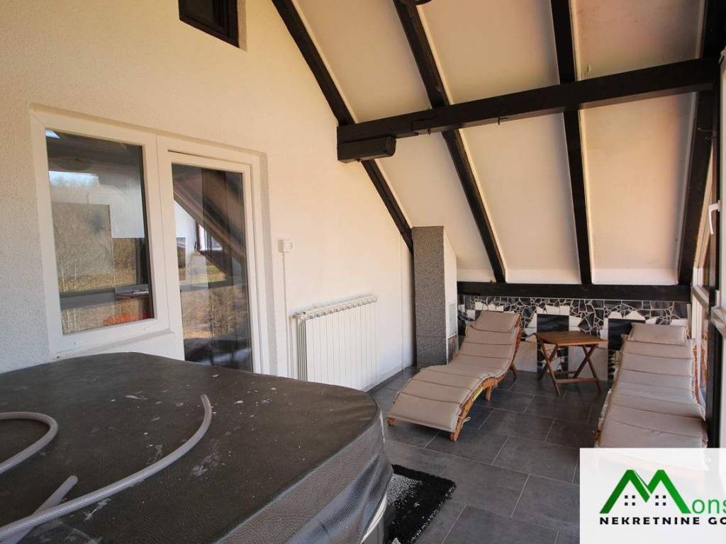U potkrovlju je dječja spavaća soba s izlazom na mali balkon te glavna spavaća soba s vlastitim WC-om i izlazom na predivnu natkrivenu terasu. S terase se pruža otvoren pogled na okolnu prirodu, uz mogućnost potpunog opuštanja u jacuzziju.