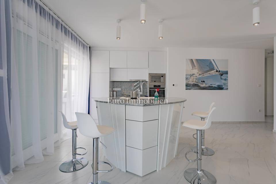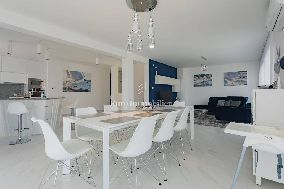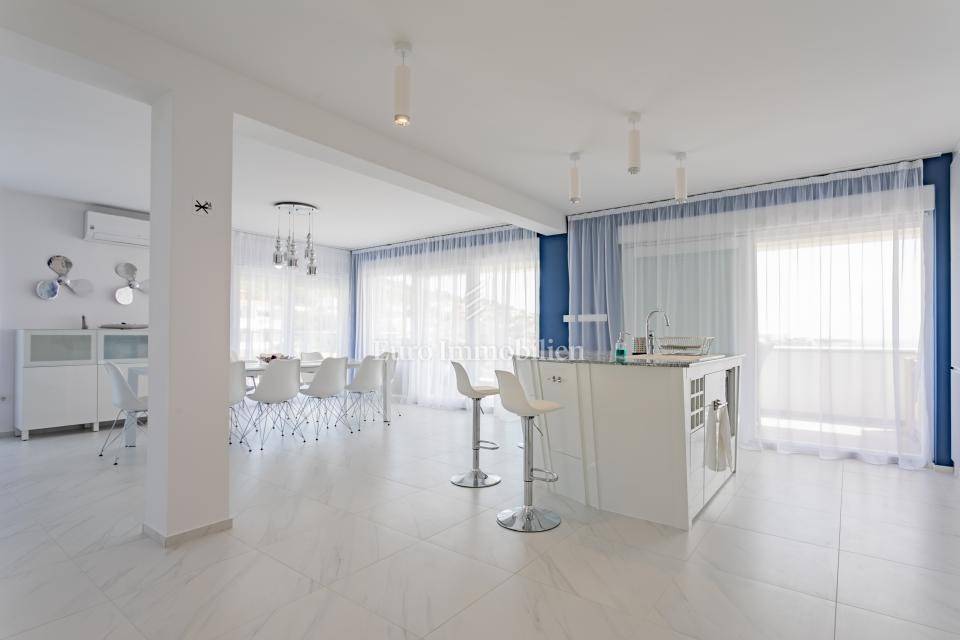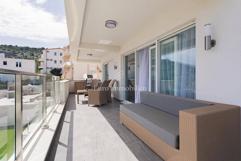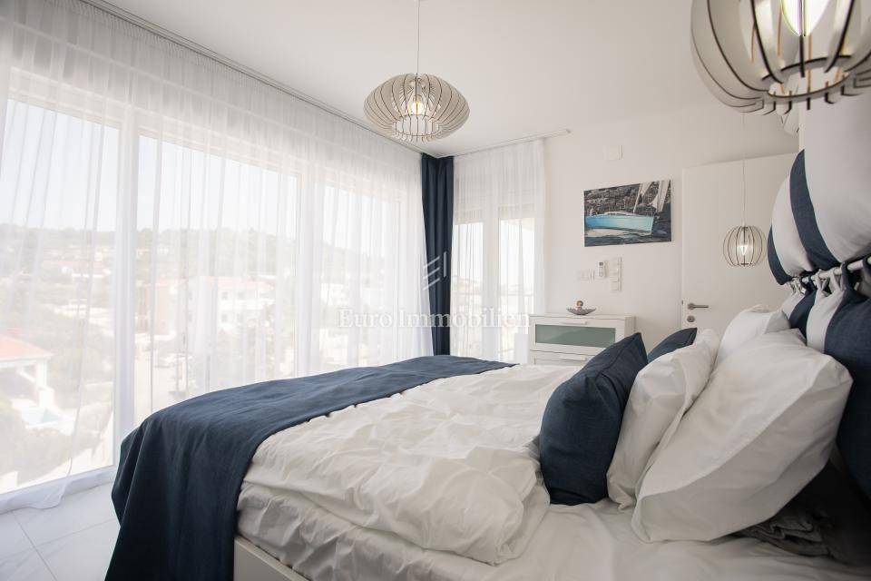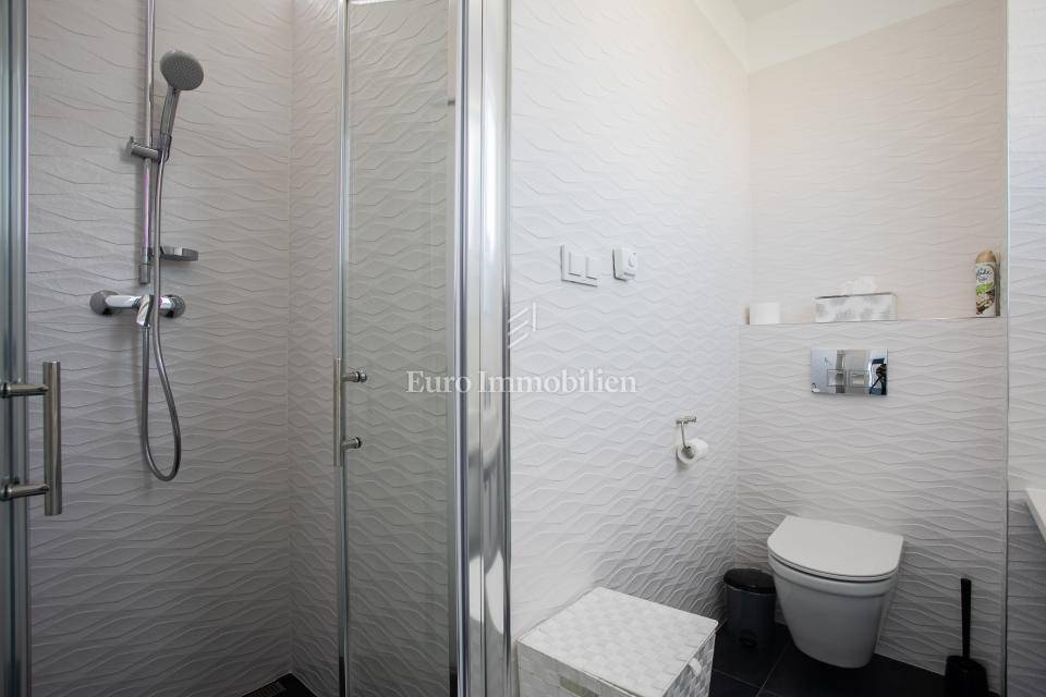 FIRST FLOOR - Consists of 3 bathrooms and 4 bedrooms, 2 of which have their own bathroom. Three bedrooms have a common loggia, and one bedroom has its own terrace, all with a sea view.