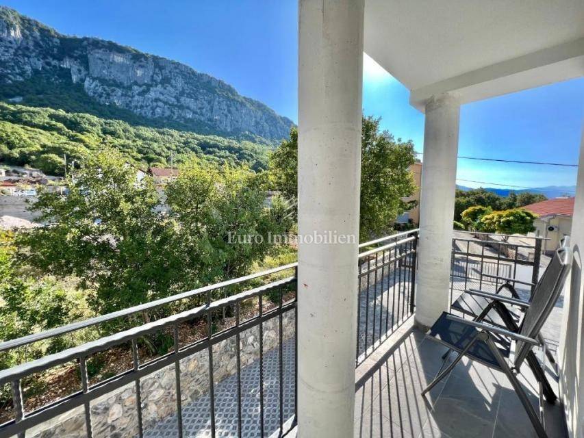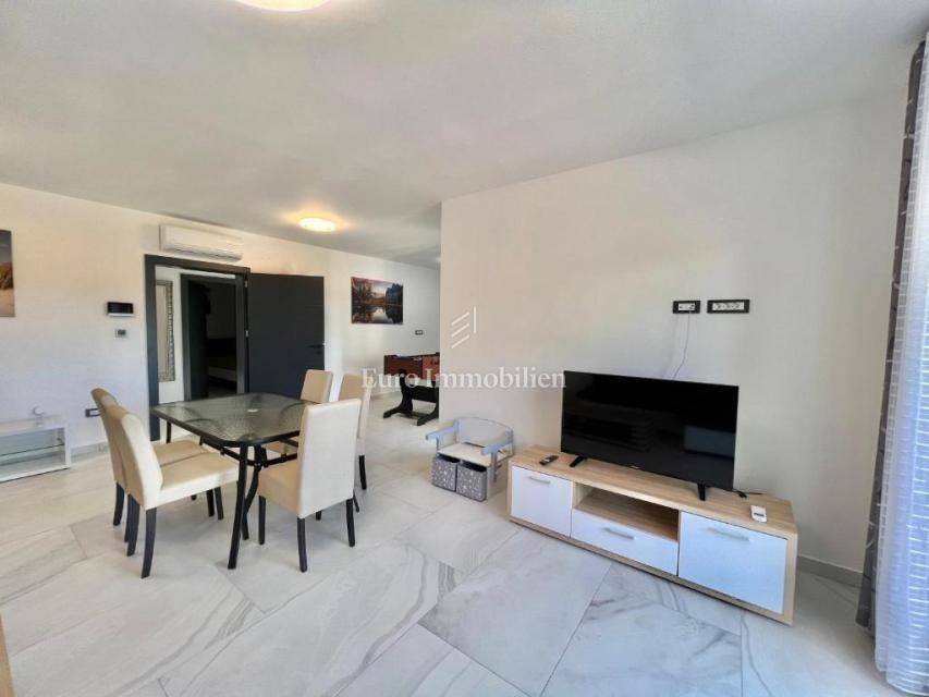 Apartment for sale on the first floor of a newly built house with a total area of 115.13 m2. The apartment consists of a kitchen with a dining room, a living room, three bedrooms, two bathrooms with associated side parts: a terrace of 19.08 m2 (4.77 m2), a covered entrance of 3.64 m2, a covered terrace of 25.44 m2 and an uncovered terrace of 7.36 m2. The apartment also includes: a parking area of 18.00 m2. The property is built with high-quality materials, underfloor heating and air conditioning are installed in all rooms. The apartment is fully furnished and ready to use for your own needs or for tourist rental. Nice and quiet location.