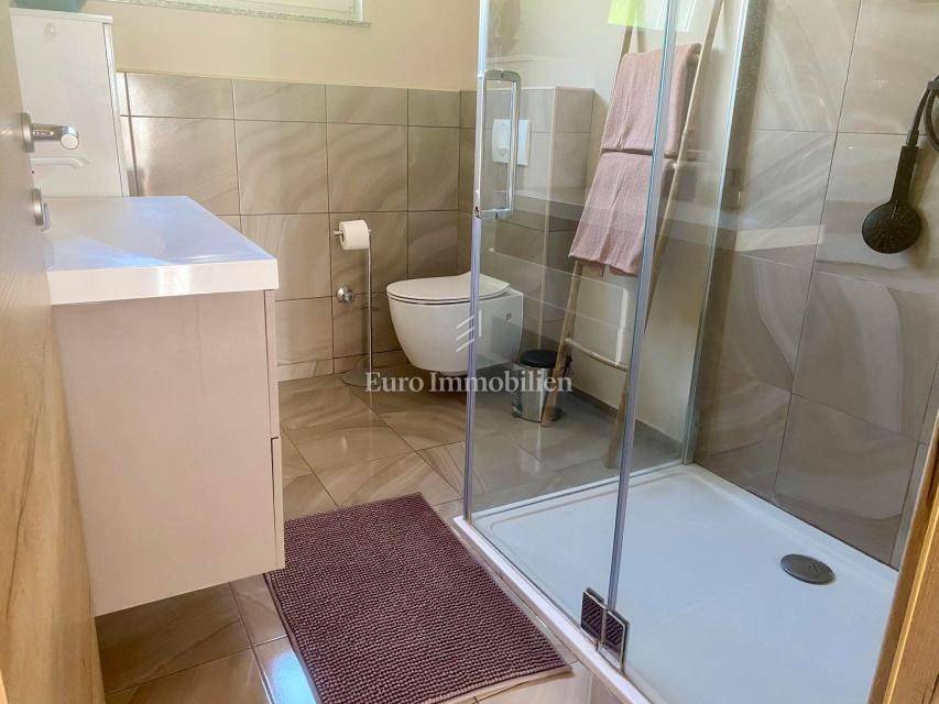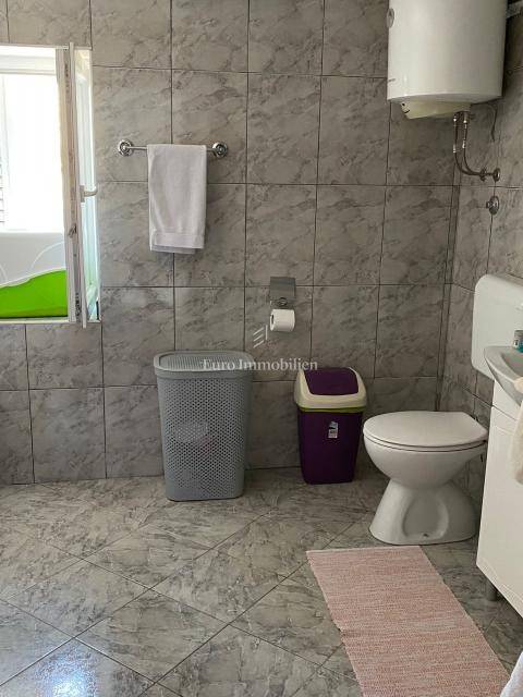 A detached seaside house with a partial sea view is for sale in Soline bay on the island of Krk. The house of 220 m2 extends over the ground floor and first floor, and was built on a plot of 908 m2. On the ground floor there are three bedrooms, a bathroom, a kitchen with a dining room and two bathrooms, and it can also be arranged as two smaller apartments. External stairs lead to the first floor, which has a large terrace, entrance hall, kitchen with dining room, living room, two bedrooms, bathroom and laundry room. The house was completely renovated in 2019, and there is a garden, several parking spaces and a garage for one vehicle in the garden. It is possible to build a swimming pool, and it is ideal for a larger family or use for tourist purposes.