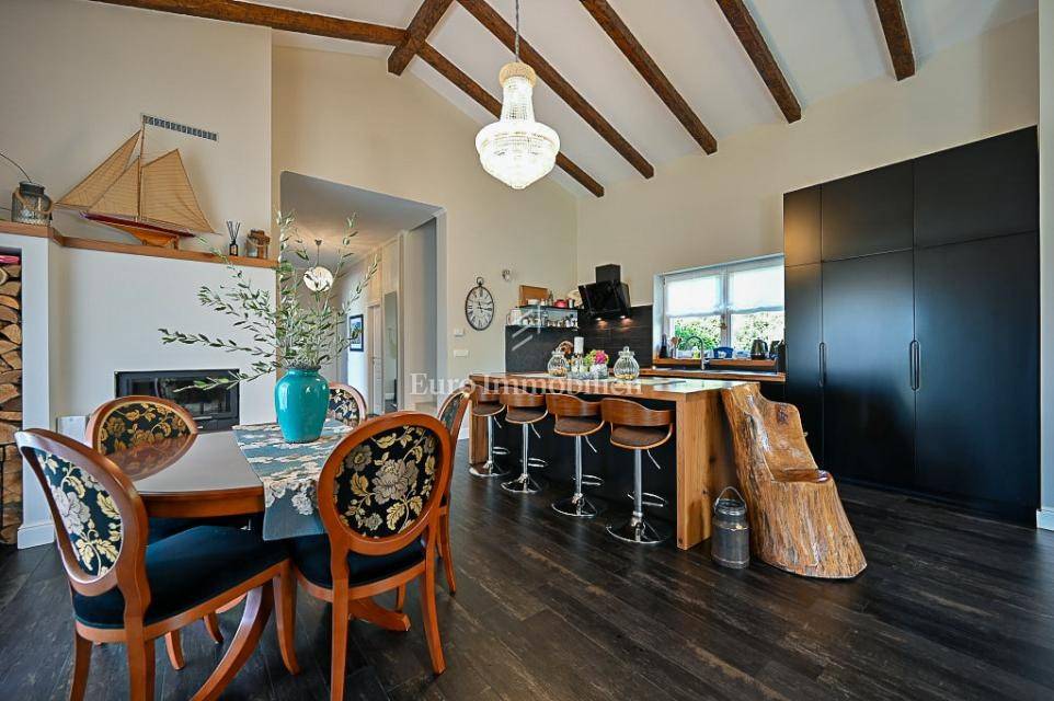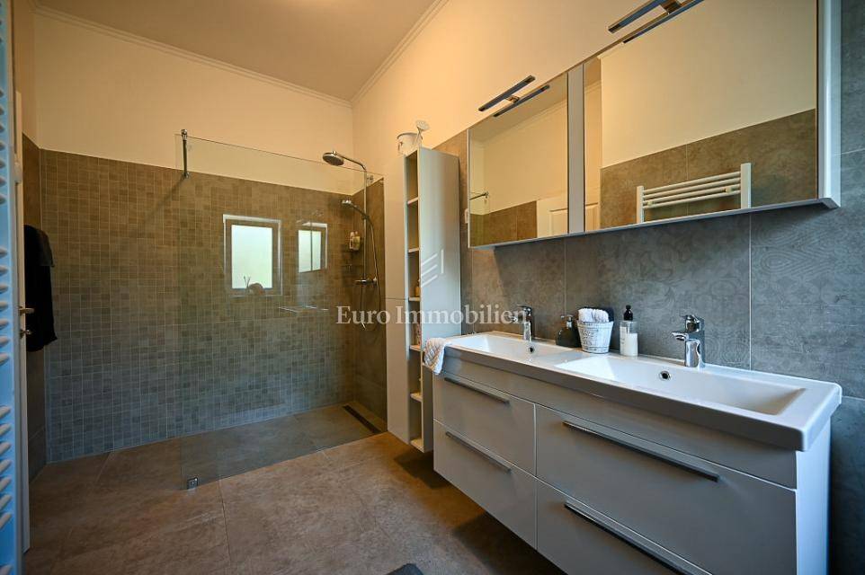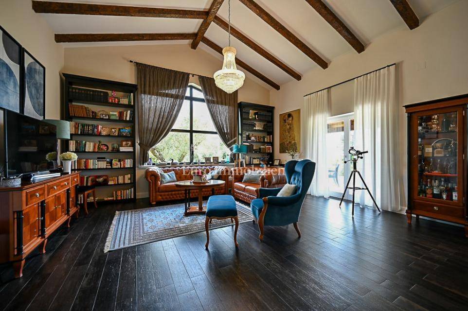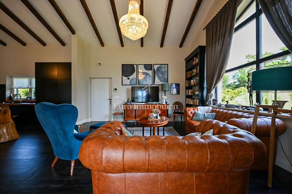 The main house (150 m²) features 3 bedrooms, 3 bathrooms, a guest toilet, a kitchen, and a living room. Heating is provided by a central system with a heat pump, connected to solar panels and a wood-burning fireplace. All furniture is custom-made and included in the sale.