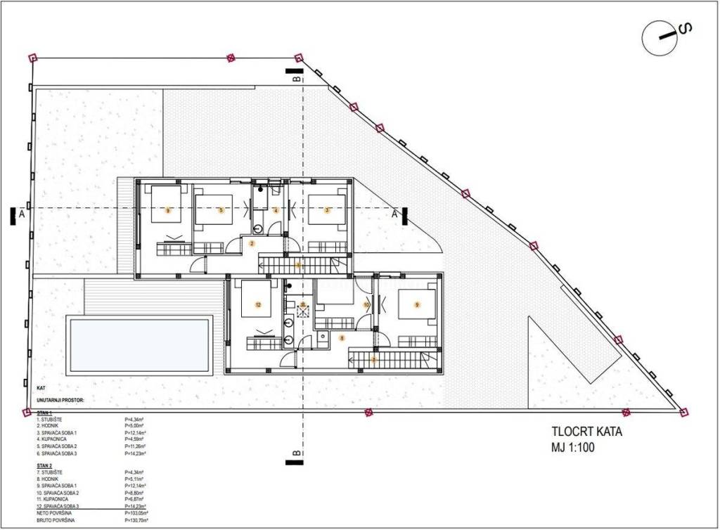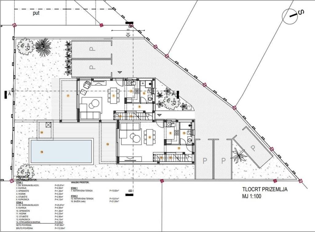 APARTMENT S2 consists of a ground floor, a first floor, a terrace and a garden with a pool. On the ground floor there is a living room/dining room (25.87 m2), a kitchen (4.94 m2), a storage room (1.26 m2), a corridor (3.33 m2), a staircase (2.90 m2), a bathroom (4 ,13 m2), covered terrace (10.61 m2) and swimming pool (7x3 m) with a garden. There are three bedrooms and a bathroom on the first floor. room 1 (12.14 m2), room 2 (8.80 m2) and room 3 (14.23 m2), bathroom (6.87 m2), corridor (5.11 m2) and staircase (4.34 m2).There are three parking spaces.