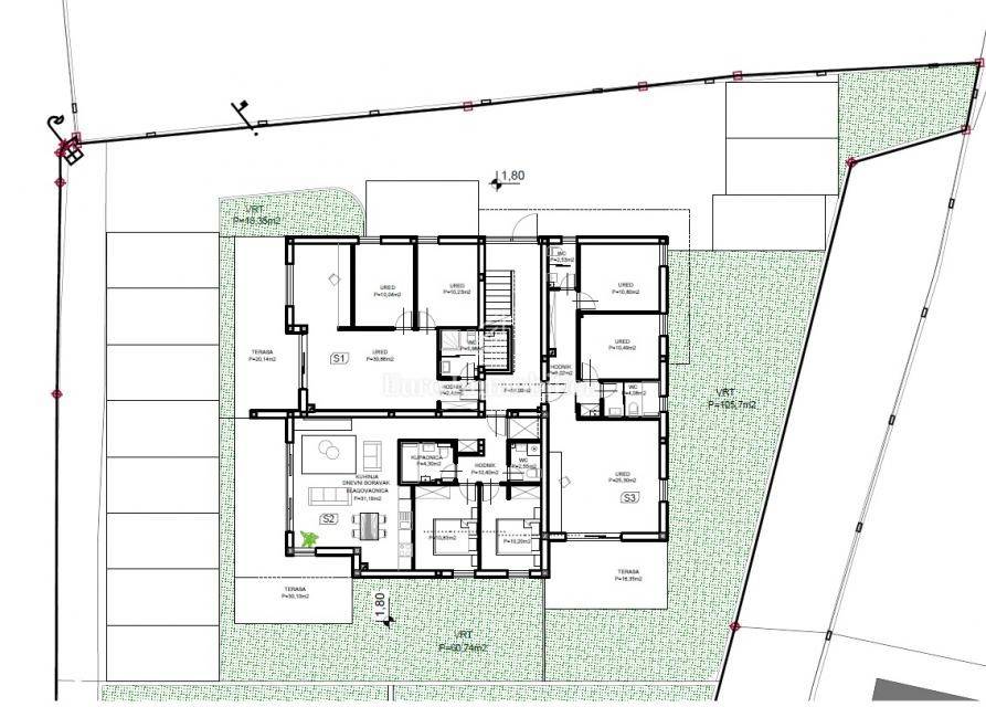 APARTMENT S3 is located on the ground floor and consists of two bedrooms, hallway, bathroom, toilet, living room, dining room and kitchen. It has a terrace of 30.10 m2, a garden of 105.70 m2 and one parking space.