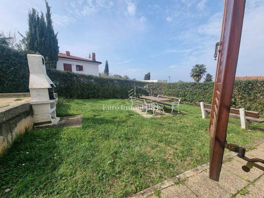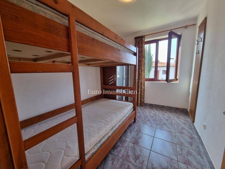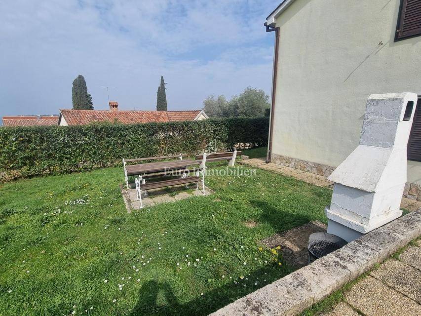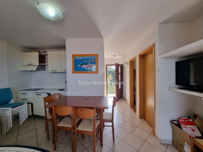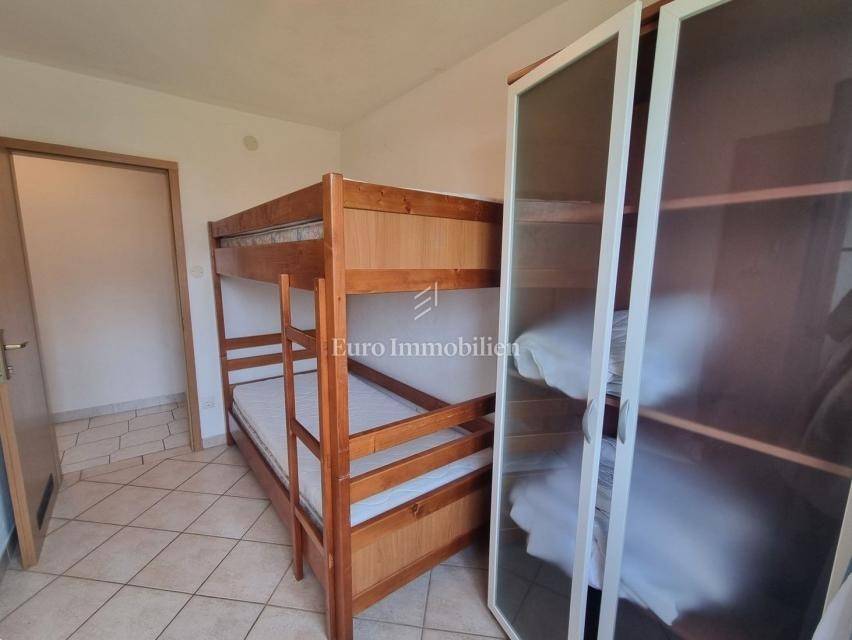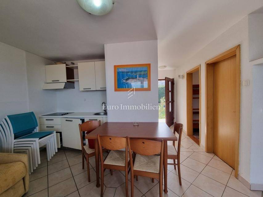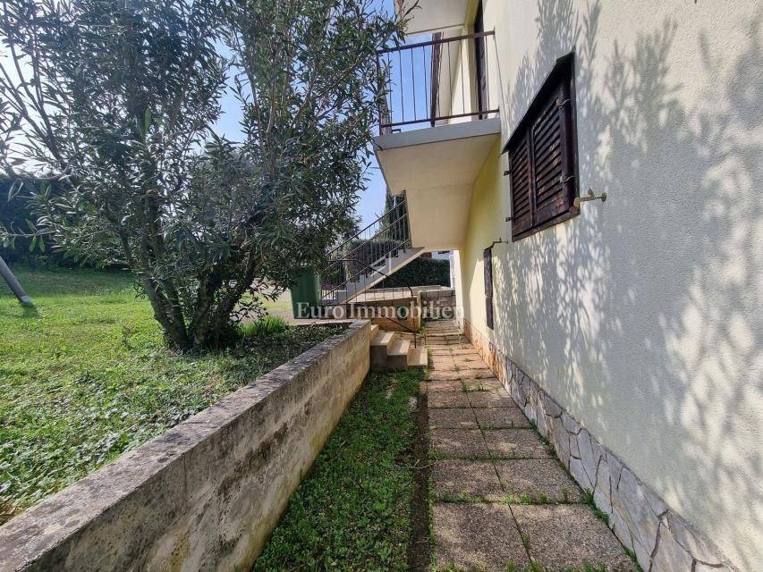 The house extends over the ground floor and first floor. On the ground floor there is an apartment of 59.61 m2 with a terrace, consisting of a hallway, two bedrooms, a bathroom, a living room with a dining room and a kitchen. From the living room there is access to a spacious covered terrace and garden. The external stairs lead to the apartment on the first floor of the same square footage and layout. From the first floor there is a beautiful view of the sea from the bedrooms, the living room and the balcony. The apartments need minor renovation, but they are functional and are rented for tourist purposes. Heating/cooling is via air conditioning. The house has 369 m2 of garden with a barbecue and parking.