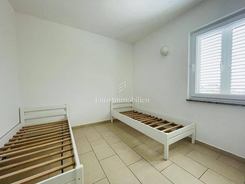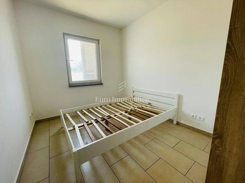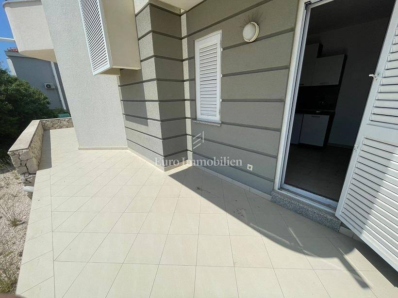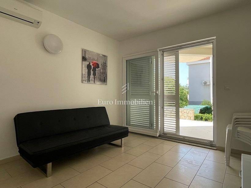 The interior living space has a usable area of 49.84 m2, and consists of an entrance hall, living room with kitchen and dining room, 2 bedrooms, bathroom and 2 storage rooms. Terrace of 37.49 m2 with a stone barbecue around which there is a large garden of 199.40 m2. The apartment has a large parking space for 2 cars of 25.00 m2. It is air-conditioned and partially furnished. It is a 15-minute walk from the beach and the center of Novalja. It is sold without furniture. Ownership is neat.