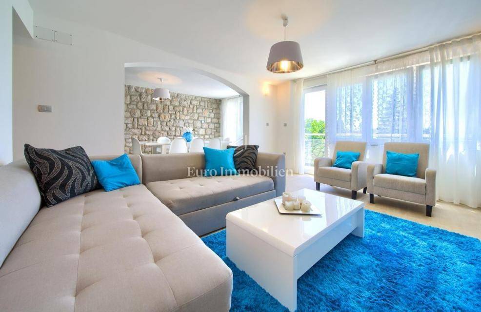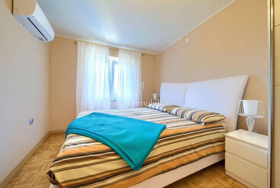 The house is spread over three floors. In the basement there is a social room with a toilet. On the ground floor there are two bedrooms, a kitchen, a living room and a bathroom, and the first floor has an exit to a balcony on the south side with a sea view. Heating is provided by air conditioning and electric radiators. Spiral stairs lead to the first floor where there are three bedrooms, a balcony with a beautiful view of the sea and the island of Krk, two bathrooms, a hall with a wardrobe and a boiler room, with a separate external entrance. In the courtyard of the house there are three parking spaces, an additional room and a grill.