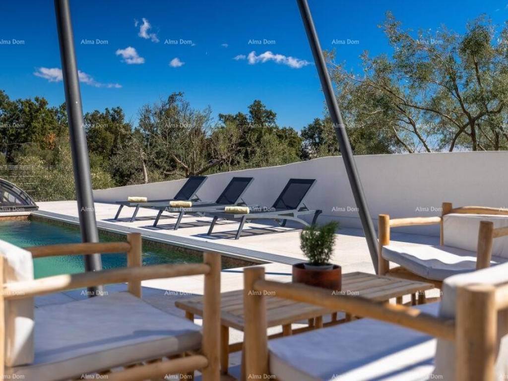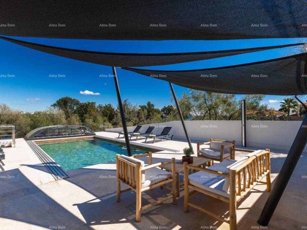 The villa consists of two levels. The ground floor offers a practical and functional layout: a modern kitchen connected to the dining area, a utility room, a guest toilet, three bedrooms, each with its own bathroom.
