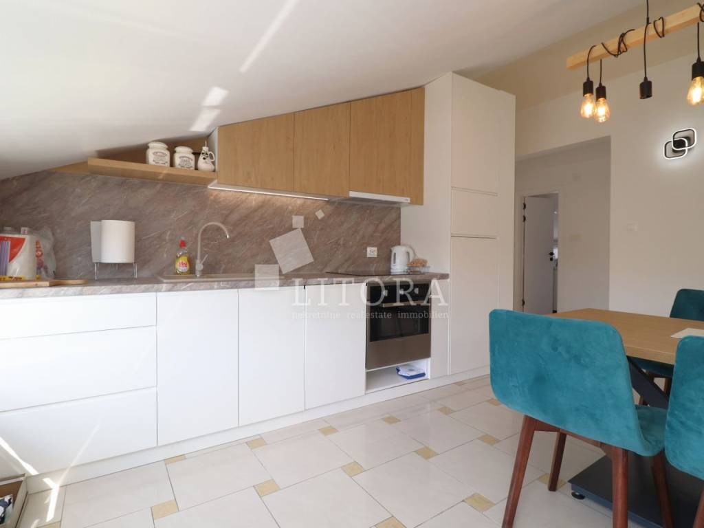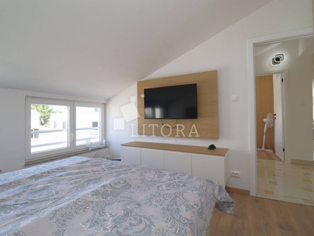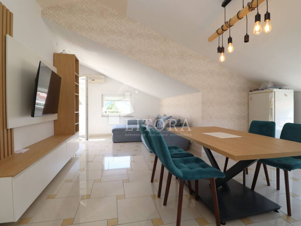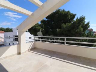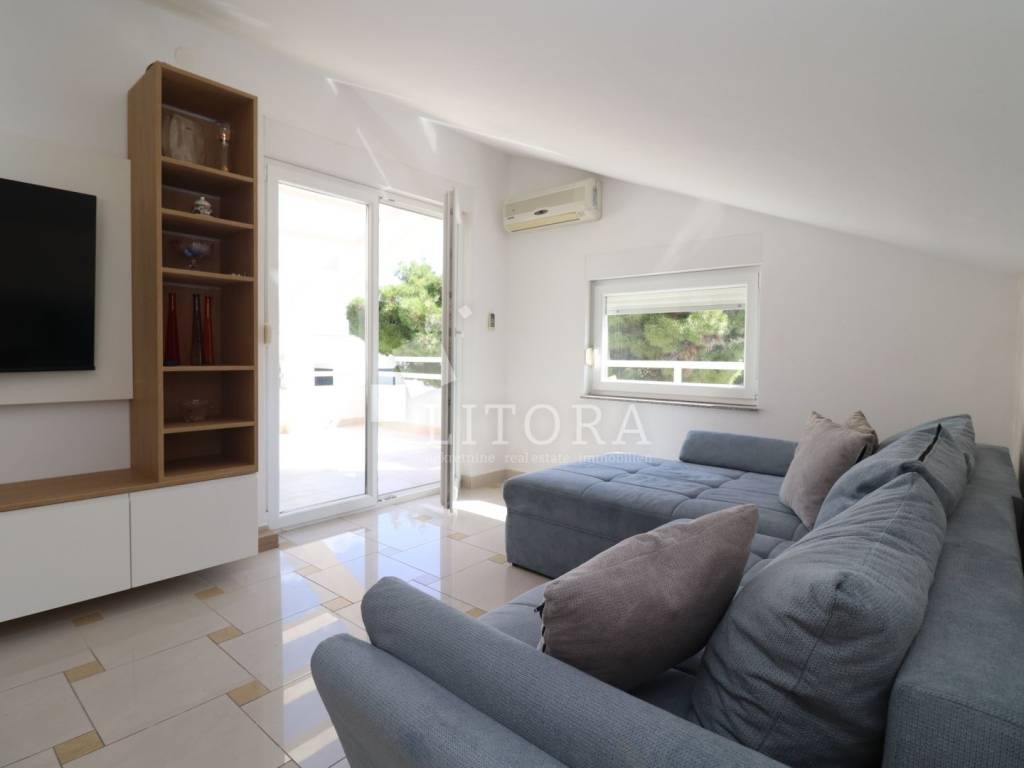 The apartment is located in the high attic of a residential building, oriented to the southeast, and consists of an entrance hall, a kitchen with dining area and living room with access to a large terrace, two bedrooms, and a bathroom. The apartment is fully furnished and newly equipped with air conditioning. It also includes one parking space in front of the building. The distance to Lovetovo Beach is 250 m, and to the city center 1.100 m.