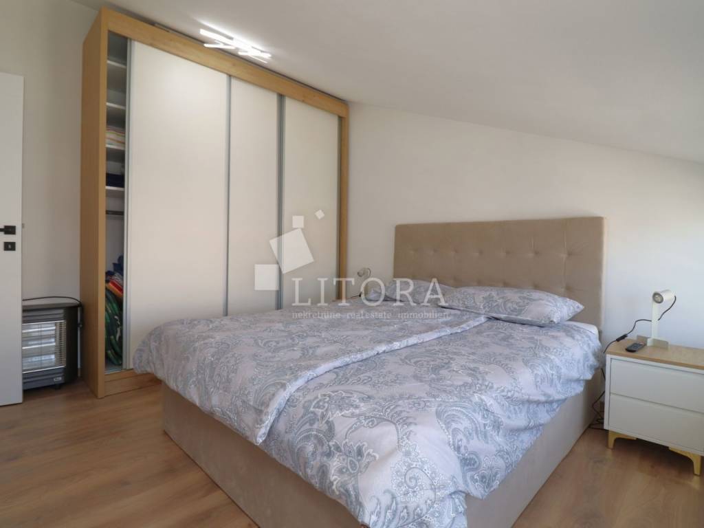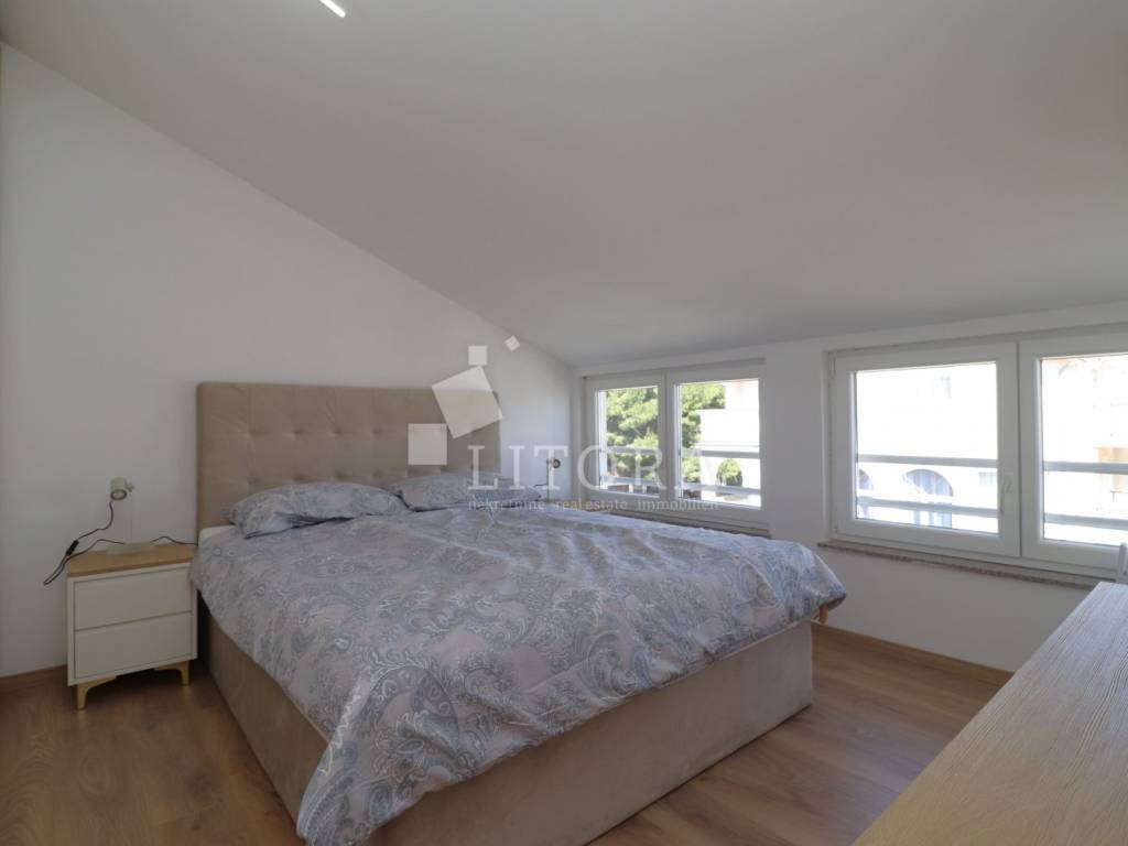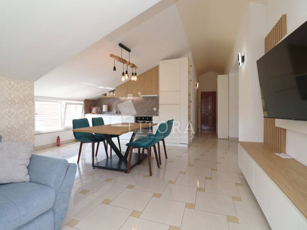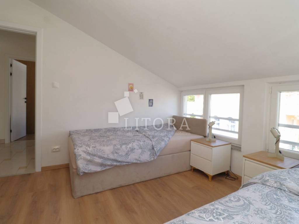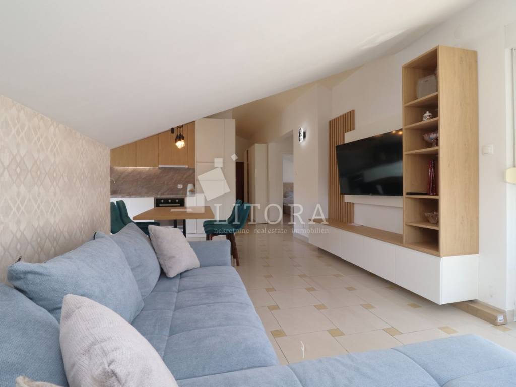 The apartment is located in the high attic of a residential building, oriented to the southeast, and consists of an entrance hall, a kitchen with dining area and living room with access to a large terrace, two bedrooms, and a bathroom. The apartment is fully furnished and newly equipped with air conditioning. It also includes one parking space in front of the building. The distance to Lovetovo Beach is 250 m, and to the city center 1.100 m.