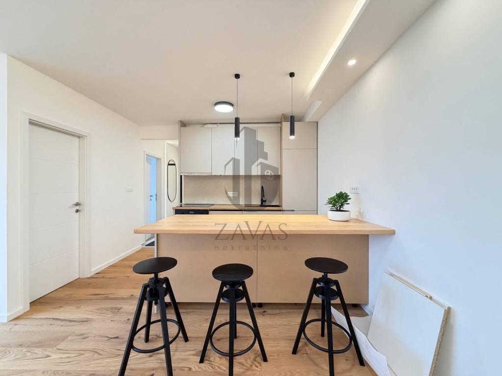 Stan je odličnog rasporeda te se sastoji od velikog dnevnog boravka integriranog s kuhinjom i blagavaonom, kupaonicom s wc-om, dvije spavaće sobe i hodnika.