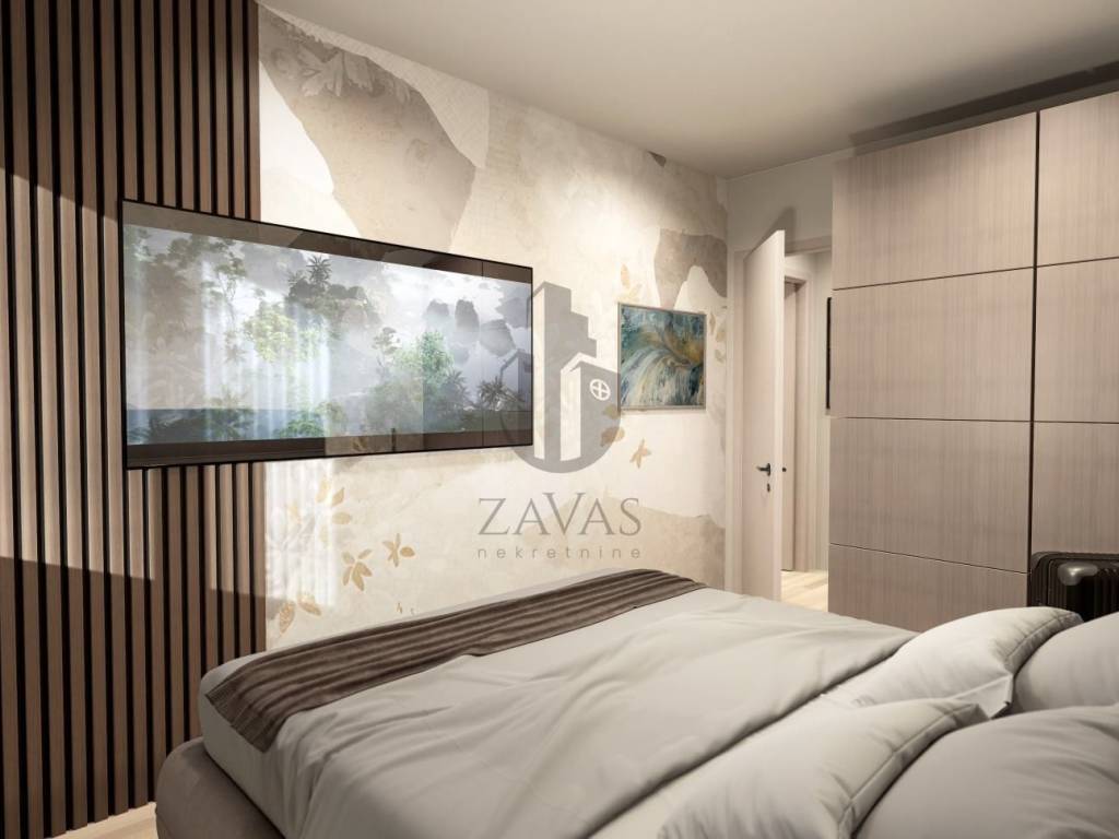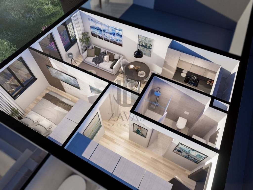 Sastoji se od: dnevnog boravka, spavaće sobe, kuhinje, kupaonice te balkona.