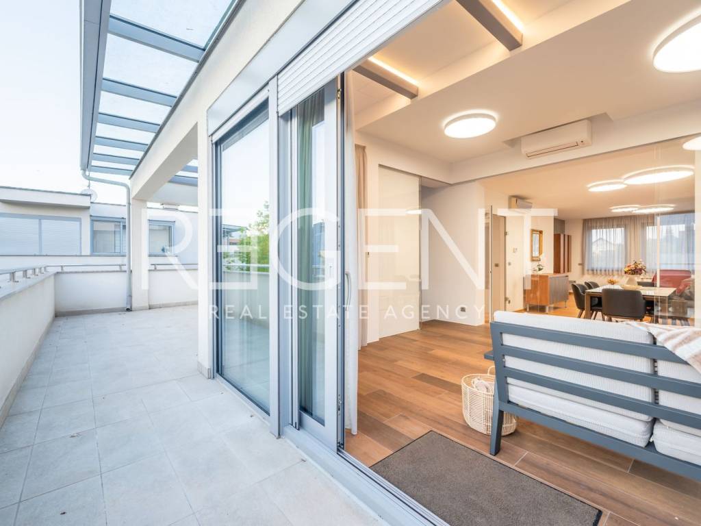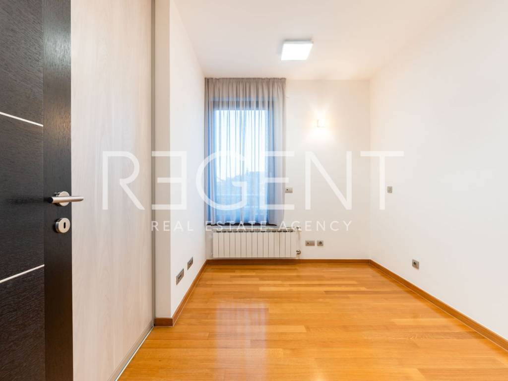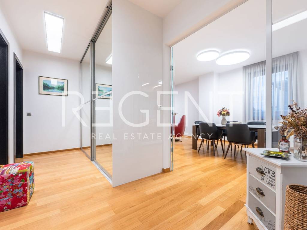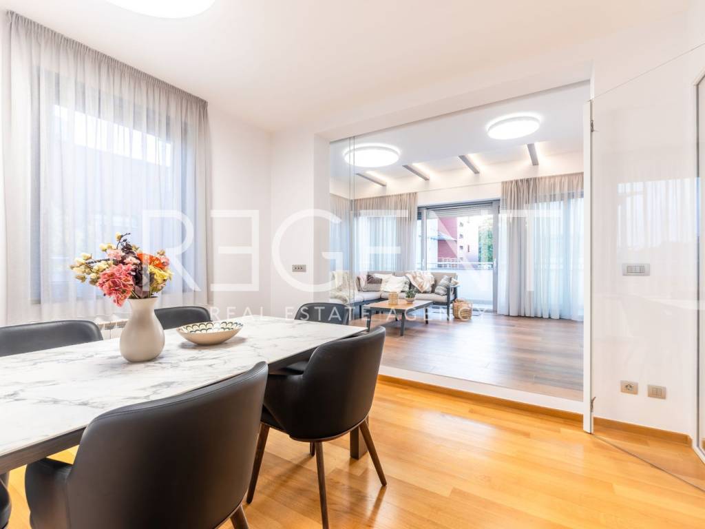 In a quiet part of Srebrnjak, a fully furnished three-room apartment with a closed area of 113.02 m² is available, located on the second floor of a new building. The apartment consists of an entrance hall with built-in wardrobes, a spacious living room with dining area and kitchen, two bedrooms, one bathroom with toilet, a guest toilet and a covered terrace of 27.47 m² (6.86 m²). It is equipped with central gas heating, air conditioning, electric shutters, intercom and security doors. It has an energy certificate C. The apartment has two garage parking spaces and one outdoor parking space. The apartment is located in a quiet street, close to public transport and all necessary amenities such as shops, schools and kindergartens. For more information or to arrange a viewing, feel free to contact us!