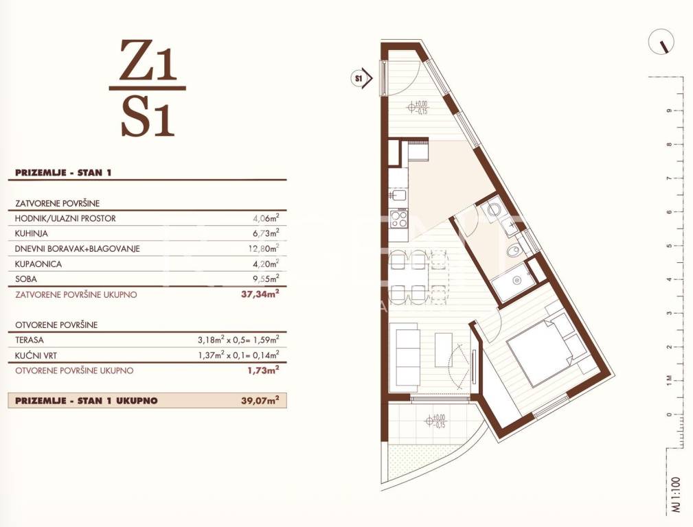 Apartment S22 is part of the Altura Residences project, a new residential development located in the Visoka neighborhood of Split, offering a modern living concept and a high level of construction quality. Situated on the fourth floor of building Z1, this one-bedroom apartment with a loggia and terrace is an excellent choice for couples, small families, and buyers seeking a functional home in a quiet location, with long-term property value in one of Split's most sought-after areas. The total net area of the apartment is 53.67 m². The apartment consists of an entrance area, a separate toilet, a hallway, two bedrooms, a bathroom, and a living area that combines a 5.20 m² kitchen and a 13.05 m² living room with a dining area. From the living area, there is access to a 3.10 m² loggia and a 9.80 m² terrace, which represent a natural extension of the interior space and provide a pleasant area for relaxation and outdoor living. Large glass walls further emphasize the interior's airiness and allow for abundant natural light throughout the day. Altura Residences consists of two modernly designed residential buildings with a Mediterranean expression, designed with an emphasis on resident privacy, acoustic comfort, and long-term living quality. The architectural design is characterized by large glass surfaces, open views, and spacious outdoor areas. The apartment will be equipped with aluminum joinery with triple glazing, underfloor heating via a heat pump, and a multi-split air conditioning system for heating and cooling. The interior will feature higher-standard parquet and ceramics, a walk-in shower, top-quality sanitary ware, an anti-burglary door, and a video intercom. The project includes an underground garage and outdoor parking spaces, and the purchase of a parking space is mandatory with each apartment. Visoka stands out as a quiet and well-connected city neighborhood that offers an ideal balance between privacy and access to all amenities necessary for everyday life. Schools, kindergartens, shops, and public transport are located in the immediate vicinity, while the Mall of Split is just a few minutes' drive away. Žnjan beach is about a five-minute drive, and the historic center of Split is about ten minutes away, making this location extremely convenient for daily living, as well as a safe investment in an attractive city address. The planned completion of construction and move-in are scheduled for the second half of 2027, and purchase is also possible through a mortgage loan. For more information about apartment S22 and the Altura Residences project, as well as to arrange a viewing, please feel free to contact us.