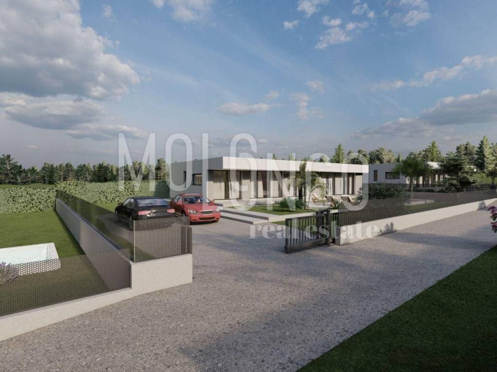 The first unit consists of 3 bedrooms and a living room and a kitchen with an open dining area, and the second unit is of the same concept with only 2 bedrooms. The exit from both apartments is to the sunbathing area with an 8x4 swimming pool. The house has a modern design with a flat roof. There is underfloor heating via a heat pump and an air conditioner for additional cooling or heating of the air. Overall, this house is built in an excellent location that is close to all important amenities, but at the same time it is set back from the main road and unwanted views and offers a view towards the green area.