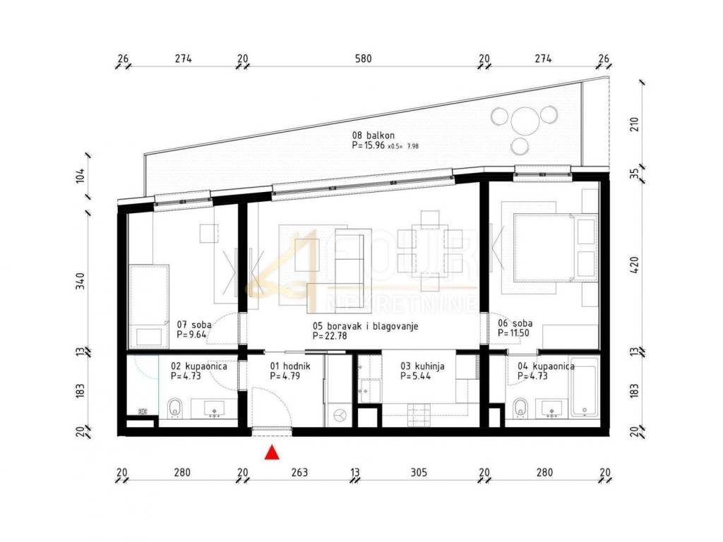 The apartment with an area of 72.69m2 consists of two bedrooms, an open living room with a modern kitchen, two bathrooms and a balcony overlooking the sea and the surrounding nature. The apartment comes with a storage room and a garage parking space, which further contributes to comfort and practicality.