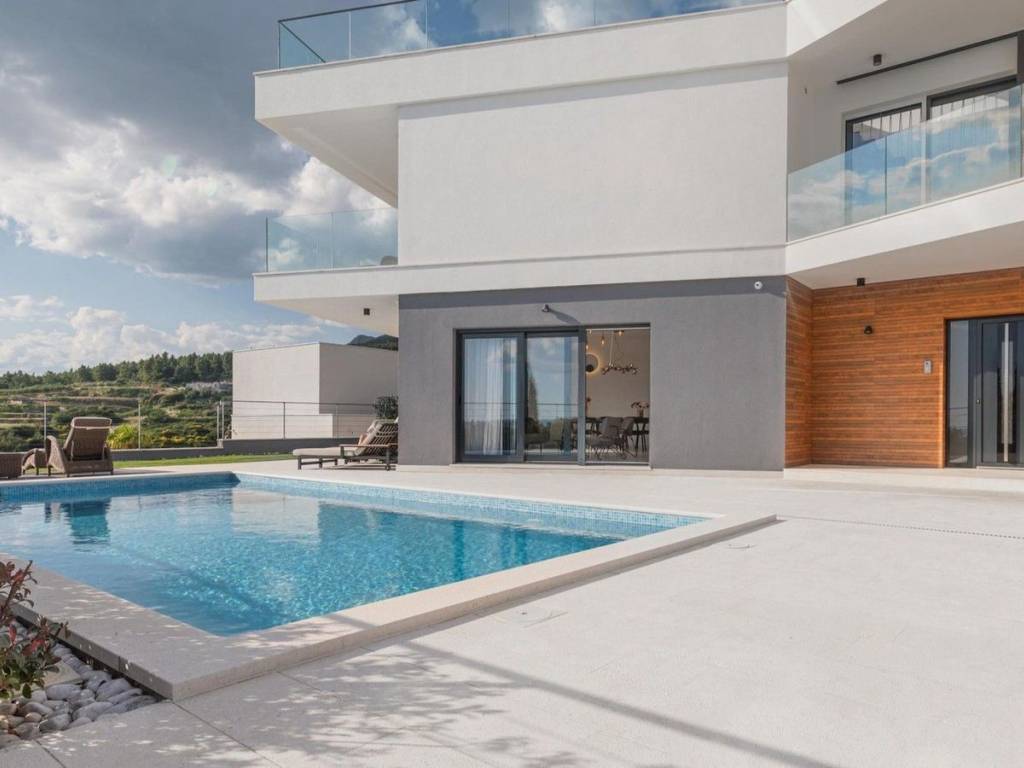 For sale is a villa located in the vicinity of the city of Split. The property extends over three floors and has a total living area of 320 m2. It is located on a plot of land of 975 m2. The basement floor is designed as a space for entertainment, and it houses a cinema hall, sauna, gym, bathroom, toilet and laundry room. The ground floor has an open concept and includes the living room, kitchen and dining room. On this floor there is also one bedroom, two toilets and a bathroom with a shower. From the living room there is a direct exit to the courtyard with the swimming pool. The top floor consists of three bedrooms, each with its own bathroom and each with access to a balcony with a view of the sea. The first and second floors are connected by an internal staircase. This property also has a roof terrace with a beautiful view of the sea. There are also two covered parking spaces in the yard, and there are two more parking spaces reserved for the villa on the road. The property is only 900 m from the sea, and nearby are all the facilities necessary for a comfortable life.
