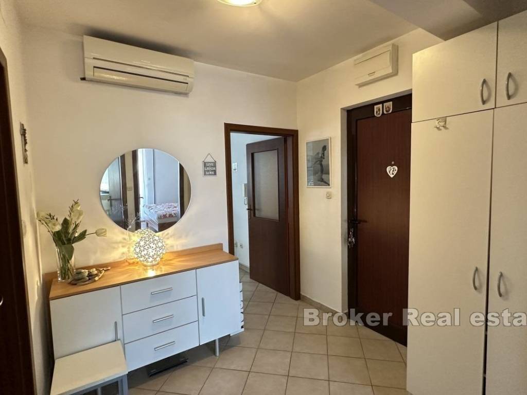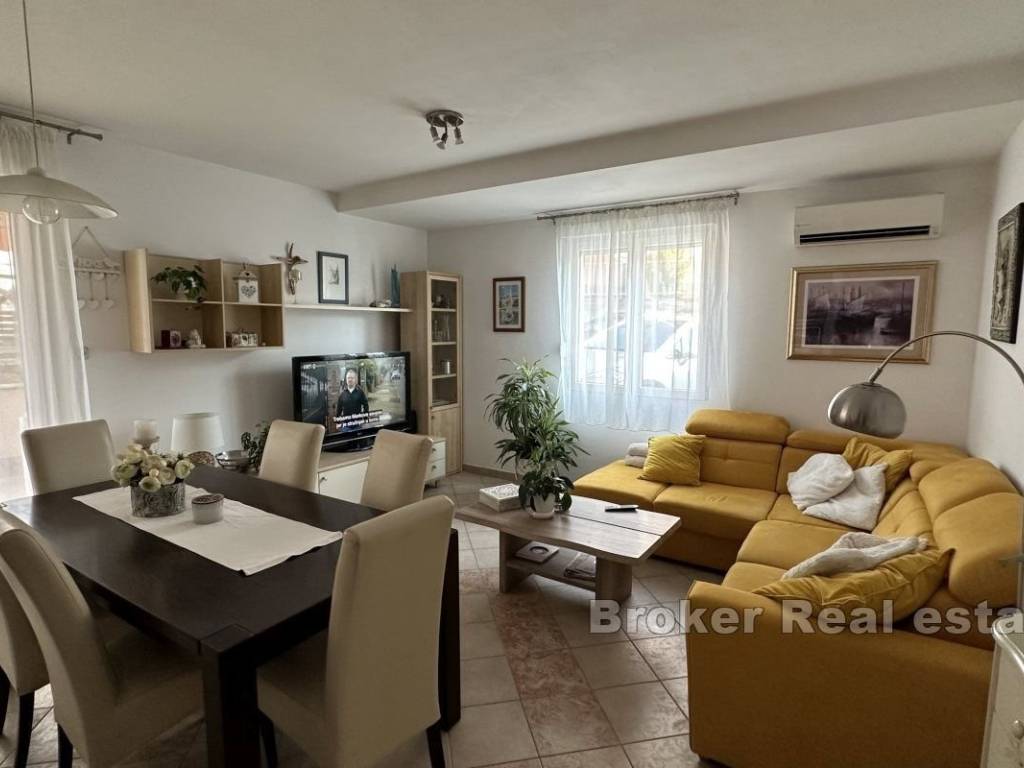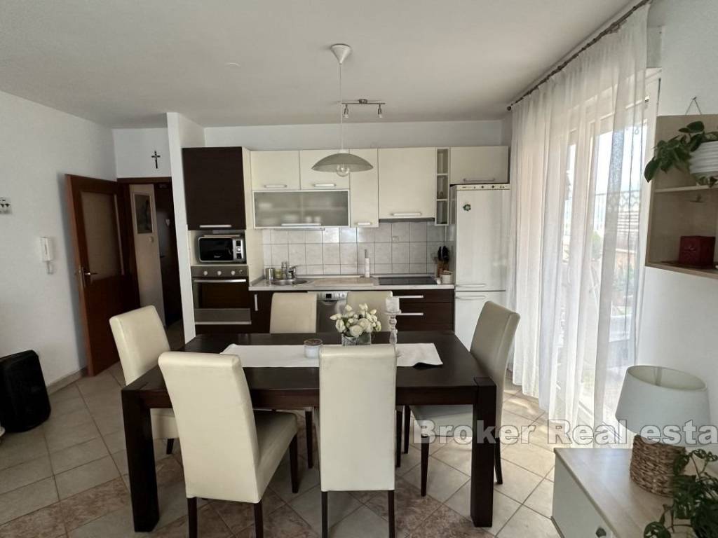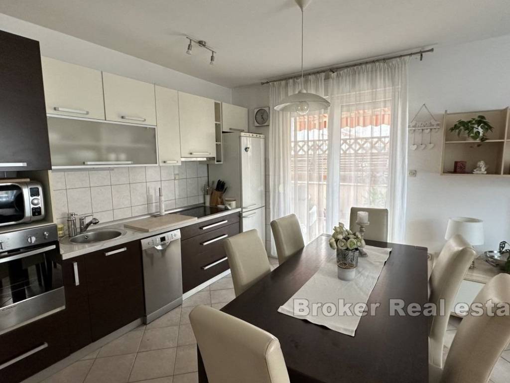 Two-bedroom apartment with a large terrace of approx. 100 m2 and a view. This two-bedroom apartment with a comfortable terrace is situated in a peaceful neighborhood, close to all essential amenities. Located on the second floor of a mixed-use building, it features 58 m² of living space and a 100 m² terrace with a city view. The apartment faces east. The layout is practical and includes a hallway, a bathroom, a kitchen connected to the living room, and a dining area with access to the terrace. The bedrooms also have direct access to the terrace. Public parking spaces are available next to the building, and residents have access to a private courtyard. The apartment offers a quiet and pleasant environment, while the terrace provides various usage options. The property is situated in a tranquil neighborhood, ensuring an uninterrupted stay and privacy despite the surrounding busy traffic. It offers diverse possibilities, including rental or long-term family living. Shops, cafes, restaurants, and other essential services are nearby, and Žnjan Beach and the city center are just a few minutes’ drive away.