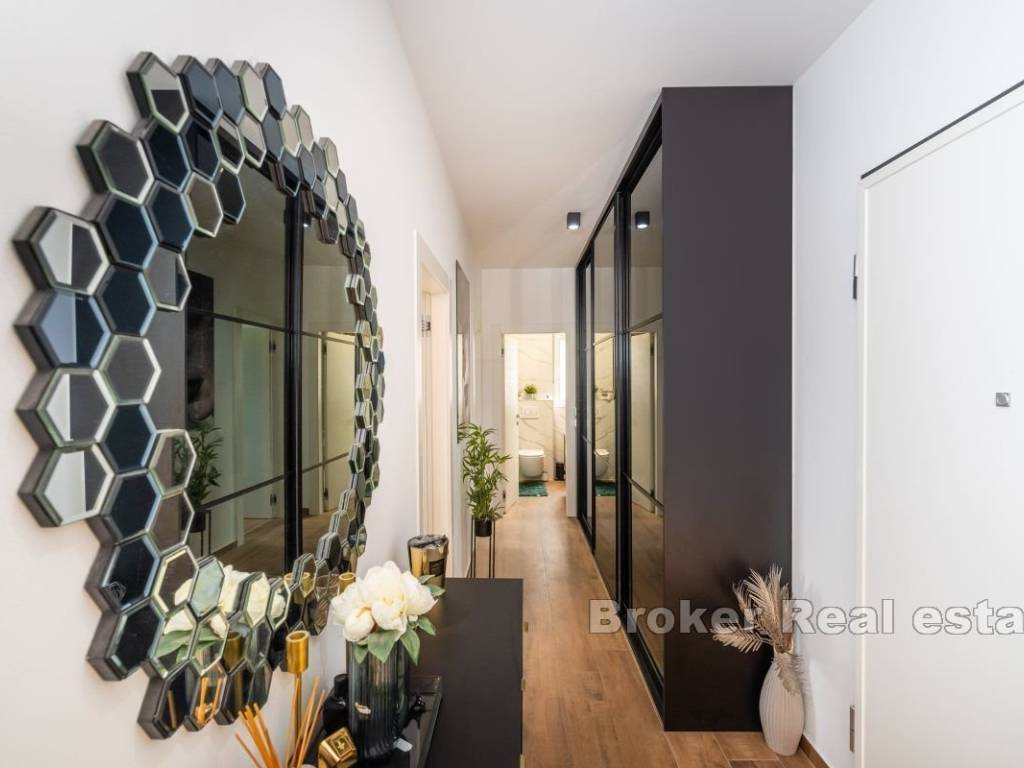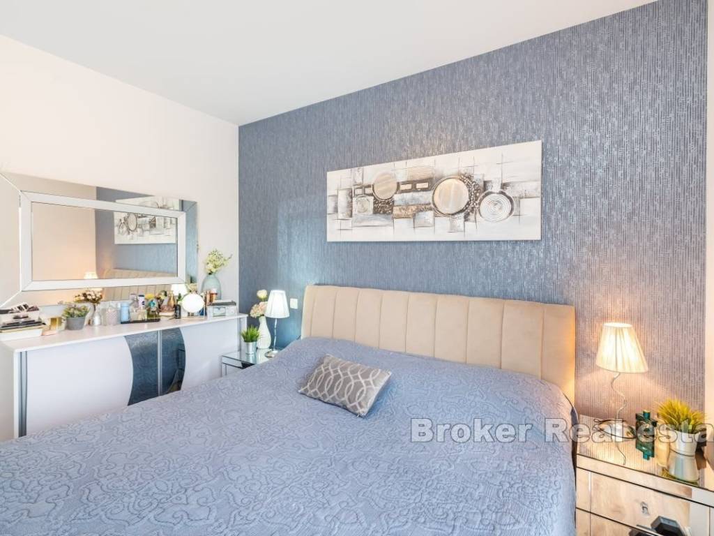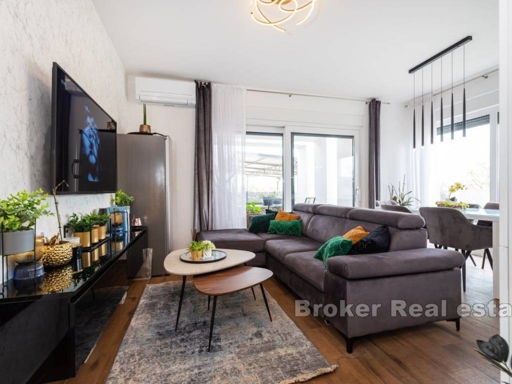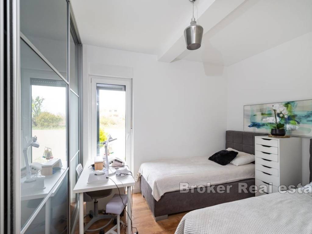 An apartment for sale in a newly built building near Zadar. The apartment is located on the ground floor and consists of two bedrooms, one bathroom, a kitchen and dining room, and a living room. The apartment has a covered terrace of 10 m2, an outdoor parking space of 13 m2, an uncovered terrace of 10 m2 and a garden of almost 100 m2. The total usable area of the apartment and special belongings is 185 m2.