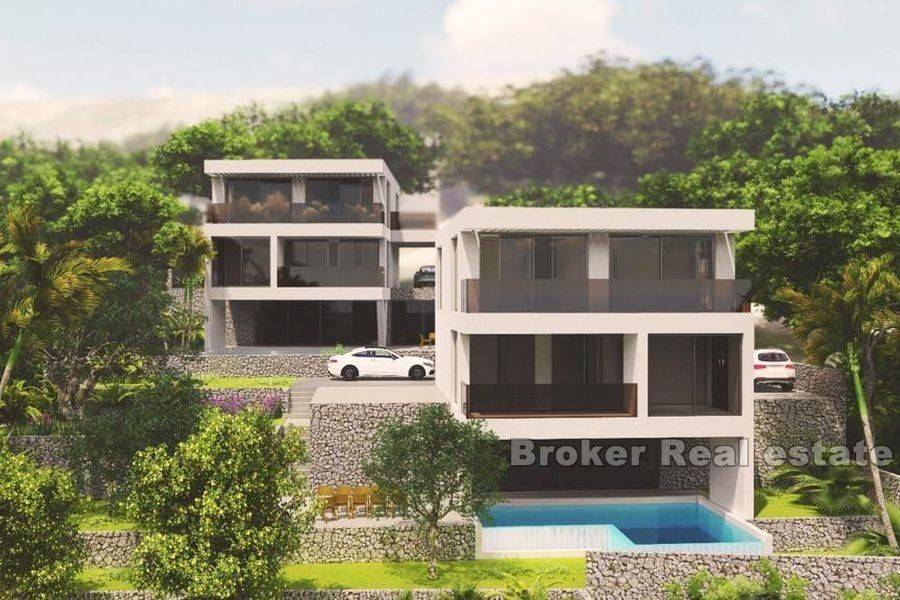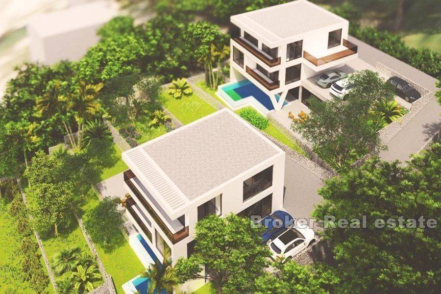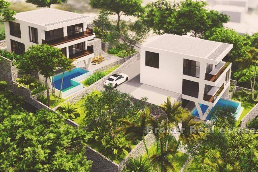 Two luxurious villas with sea view, located in a village not far from Omiš. Each villa consists of a basement, ground floor and first floor. In the basement there is a spacious living room and an open dining room, as well as a kitchen, pantry, laundry room and bathroom. This floor also has access to a large terrace with a swimming pool and a sun deck. On the next floor there is a bedroom with its own bathroom, walk-in wardrobe and terrace. On this level there is also a garage and a yard with parking. On the first floor there is a study with a terrace, a bathroom and two bedrooms with access to the terrace, one of which has its own bathroom. High-quality materials and equipment are used for the construction, and some of the features are heat and sound insulation of the exterior facade and interior floors, PVC and aluminum openings with triple-layer thermal insulating glass, electric shutters, high-quality interior and exterior ceramic tiles, motorized garage doors, solar heating. , video surveillance, horticultural landscape, modern bio pits, pumps for cleaning and filtering the pool. Thanks to the superb construction and location with a view of the sea near beautiful beaches and the town of Omiš, this is an exceptional property ideal for tourist rental as well as year-round use. It is possible to buy one or both villas. Upper villa – living surface 228 m2, plot surface 464 m2 – price: 1.100.000 € Lower villa – living surface 228 m2, plot surface 842 m2 – price: 1.380.000 €
