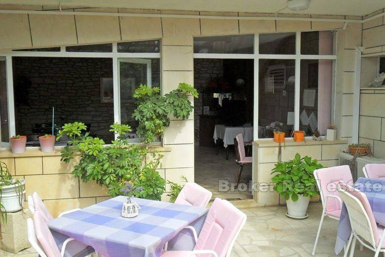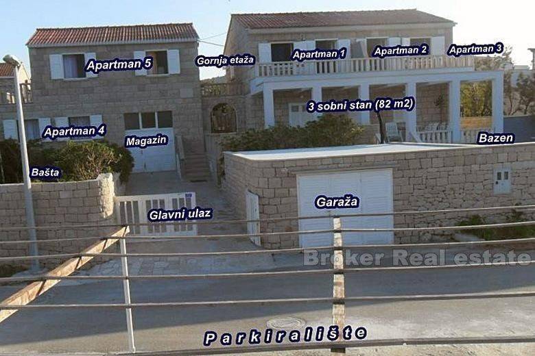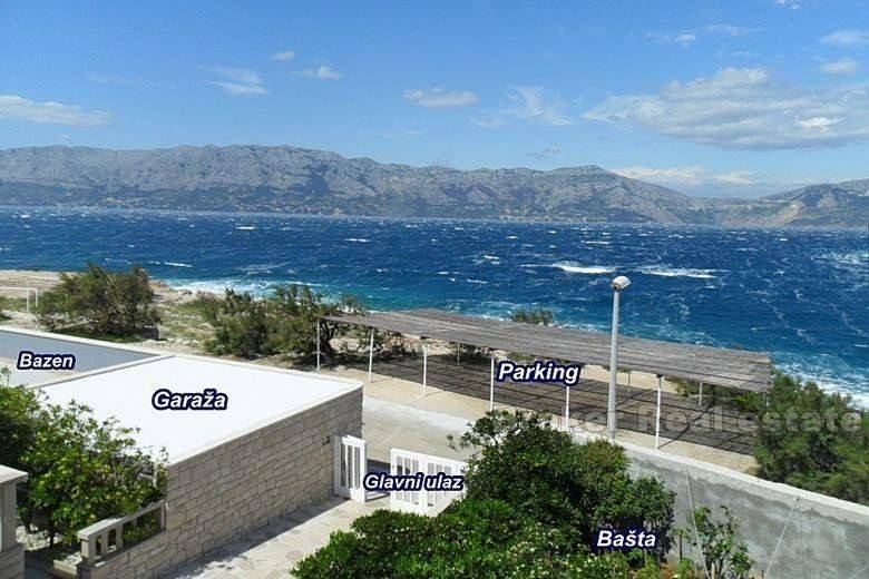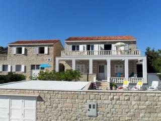 This beautiful villa is situated in an attractive location with sea view only 15m from the sea. Detached villa consists of two floors with 5 apartments (2-bedroom and 3-bedroom), private apartment of 80m2 on the ground floor, additional rooms and a garage (35m2). In front of the villa is a swimming pool (24×1.6), and behind a large terrace with barbecue and maintained garden. It has a covered area for 6 cars. The beach in front of the house is decorated and there are steps to improve access to the sea. Nearby are sandy beaches, food shops, post office, ice cream shop, coffee shop, tavern, restaurants. Great walking around the whole place offers the possibility of cycling. Brac is well connected to the mainland by frequent lines from Split to Supetar (35km) and from Makarska to Sumartin (7km). On the island there is  airport (7km). The villa is perfect for a quiet family life with the possibility of earnings due to the internal organization of the apartments.