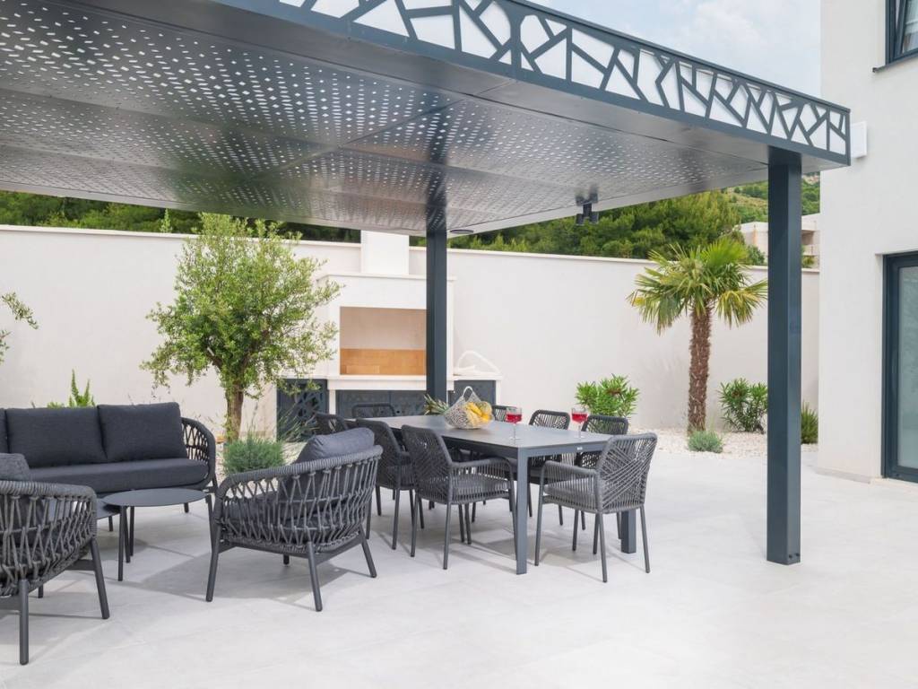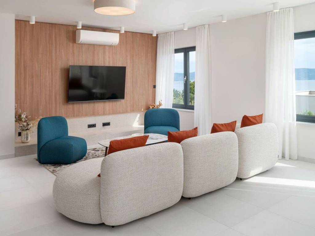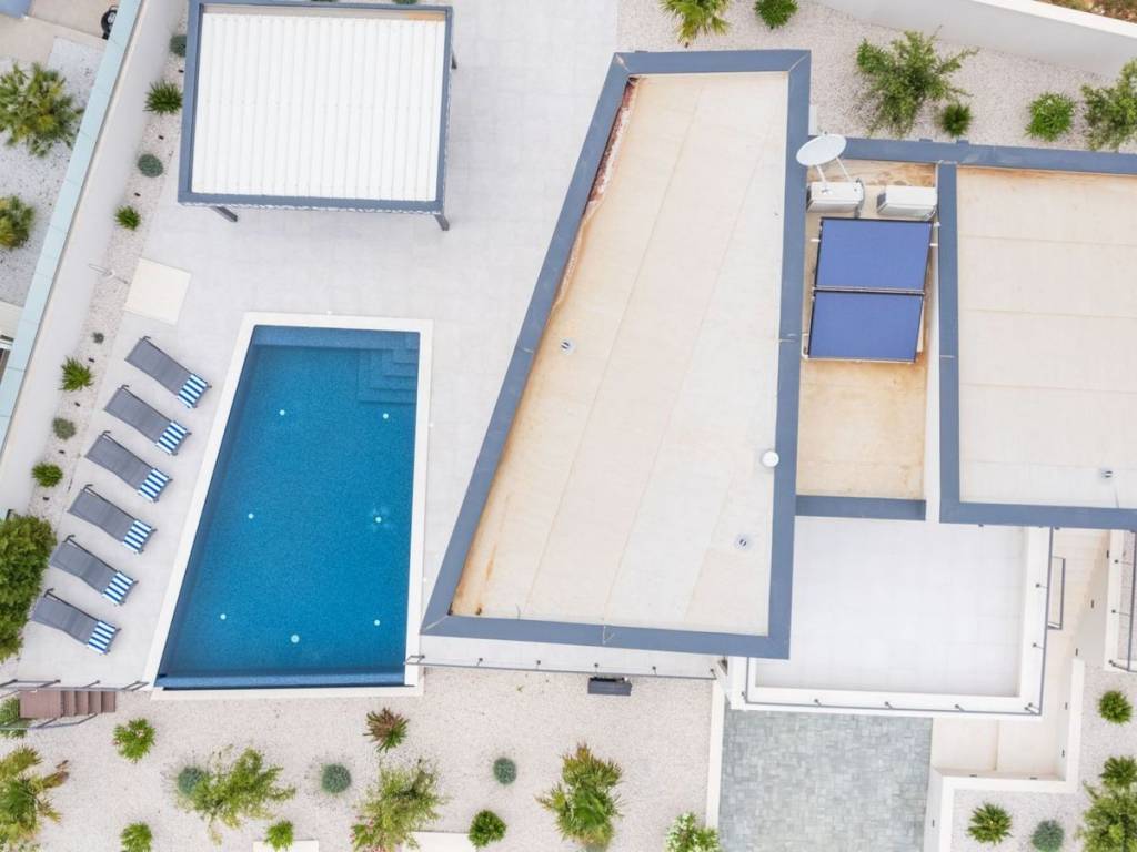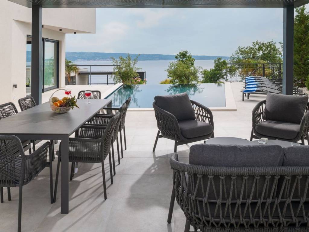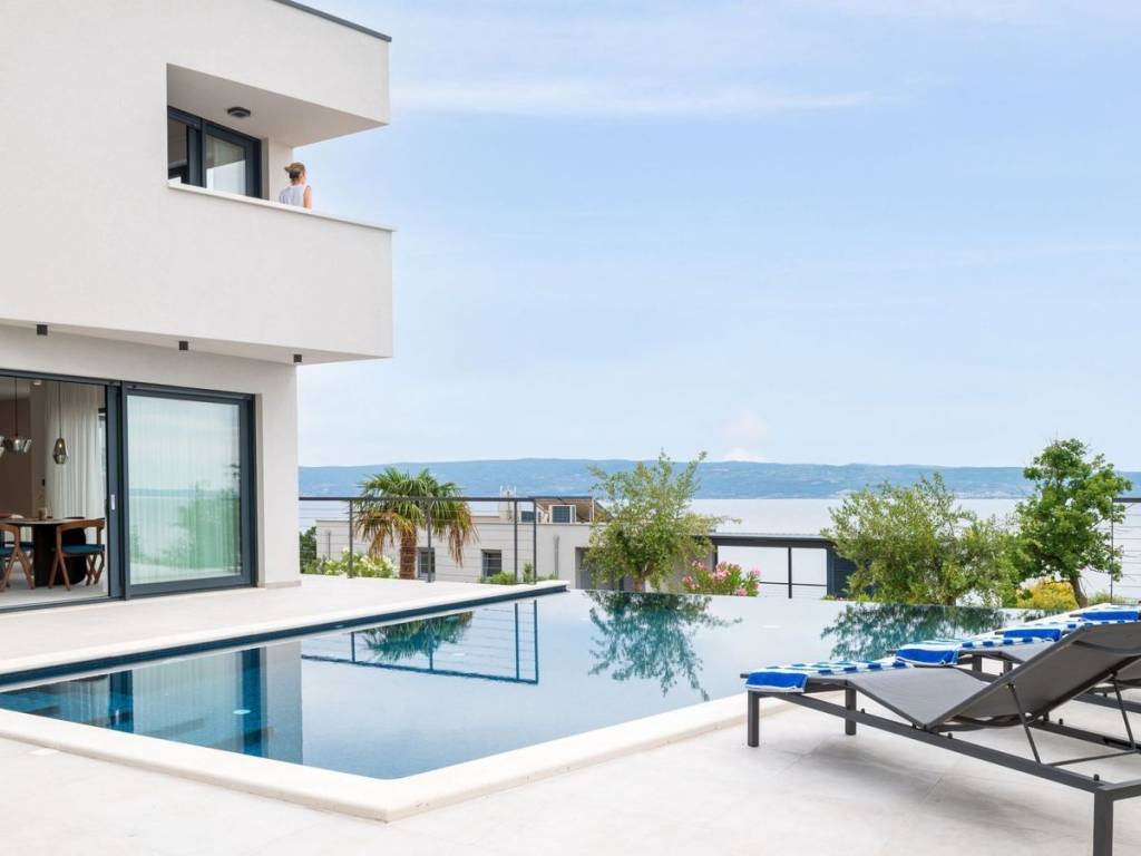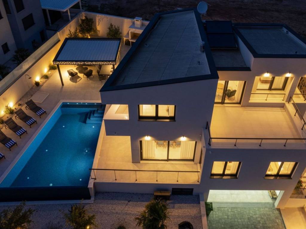 Newly built villa with pool, fully furnished and equipped, modern design and high quality located in an attractive location in Podstrana. The property with a living area of 220 m2 is located on a plot of land of 605 m2 and consists of a basement, ground floor and first floor. The ground floor consists of an open concept kitchen with dining room, living room, pantry, one bedroom and bathrooms. From the living room there is access to a covered terrace that leads to the infinity pool and offers an open view of the sea. An internal staircase leads to the floor where there are three bedrooms with attached bathrooms, with loggia and terrace. It has garage for two cars, and two additional parking spaces. Close proximity to the necessary facilities for living. Podstrana is the central Dalmatian coastal area, which as a whole faces southwest. The coastal part of Podstrana stretches 6 km longitudinally, with a series of indented pebble bays and beaches. In the northwest, it is separated from the city of Split by the lower course and mouth of the Žrnovnica river, and in the southeast it abuts the neighboring municipality of Dugi Rat.