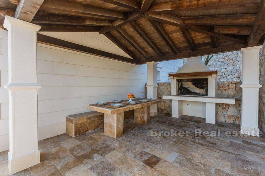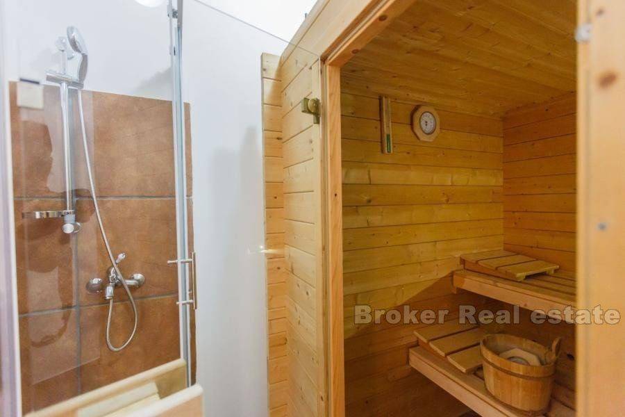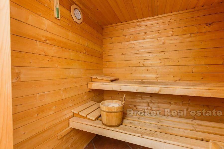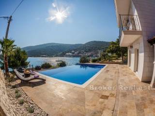 Five stars, stylishly decorated, modern villa with amazing sea views and a fabulously positioned infinity pool. This beautiful seafront family villa has something for everyone. Blessed with superb sea views, It is a newly built villa incorporating all the necessary elements for a successful holiday home: clean lines, spacious and airy rooms, lots of light, sauna, gym, infinity pool and lots of outdoor space for cooking, dining and relaxing. Most of the ground floor of Villa is given over to a large open-plan living-dining-kitchen area, with terracotta floor tiles and a series of French windows that communicate with the outside areas. Also on the ground floor is sauna with shower room and a guest toilet. After climbing a few stairs, one arrives at the first floor, where two en-suite double bedrooms are located. The first floor is also home to a small gym room with multifunctional exercise machine, exercise bike and orbitrek. Top floor features three more bedrooms, of which two have en-suite bathrooms. Villa is surrounded by a series of south-facing terraces, complete with lounge and dining areas. Sea views are amazing, especially from the infinity pool, which will almost certainly end up being the focal point of your holiday!