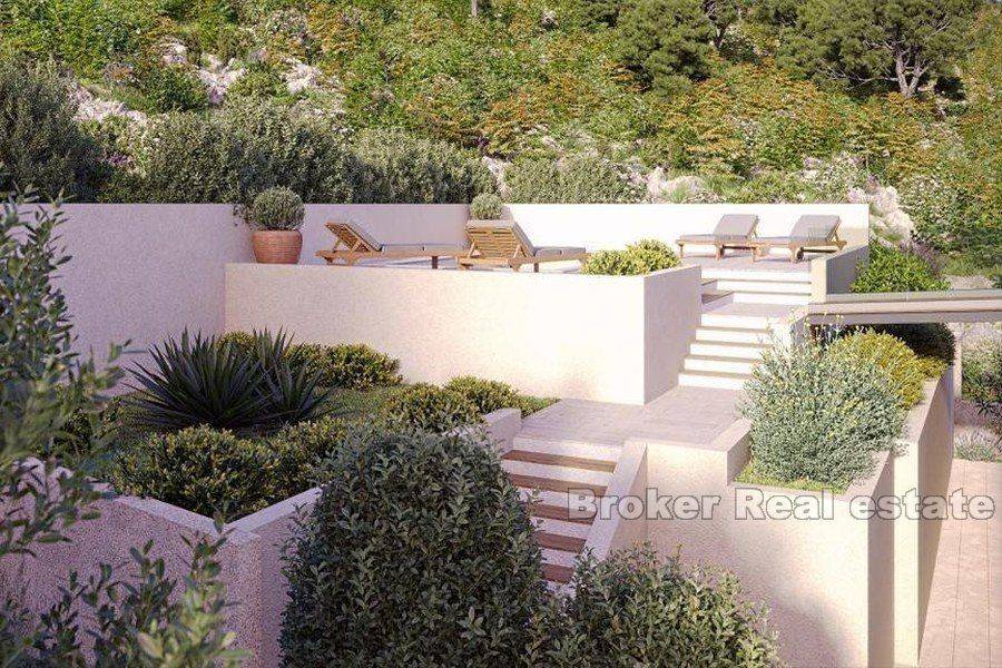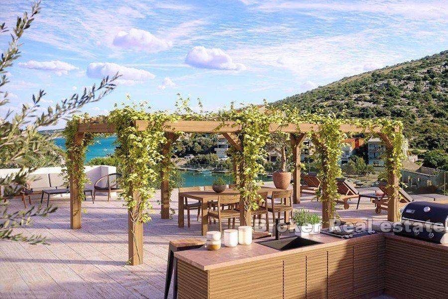 A modern villa with a wonderful roof terrace with an open view of the sea. Located in an attractive location, in the first row to the sea. The property with a residential area of approx. 220m2 is spread over two floors – basement and ground floor. The basement floor consists of an entrance hall, two bedrooms with walk-in closets, two bathrooms and a tavern. An internal staircase leads to the second floor, which consists of a spacious living room, kitchen, dining room, laundry/storage room, master bedroom with bathroom and walk-in closet, and a large balcony that stretches along the entire south-facing floor. On the roof of this extraordinary property there is a spacious terrace with a pergola, olive trees and an open-concept outdoor kitchen with a stunning view of the sea. There are three parking spaces on the cultivated garden of 600 m2. Behind the villa there is a space for a swimming pool and sun deck, which have an open view of the sea due to the excellent conceptual solution of that position. Close to all necessary facilities for living, located 50 km from Šibenik and 50 km from Split and the airport. Real estate is sold in “roh bau” condition.