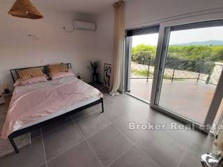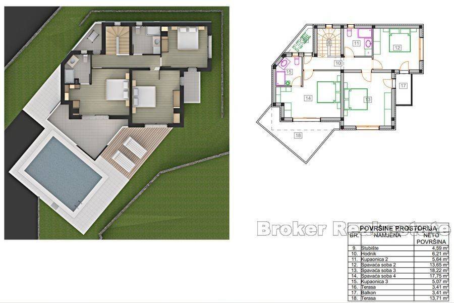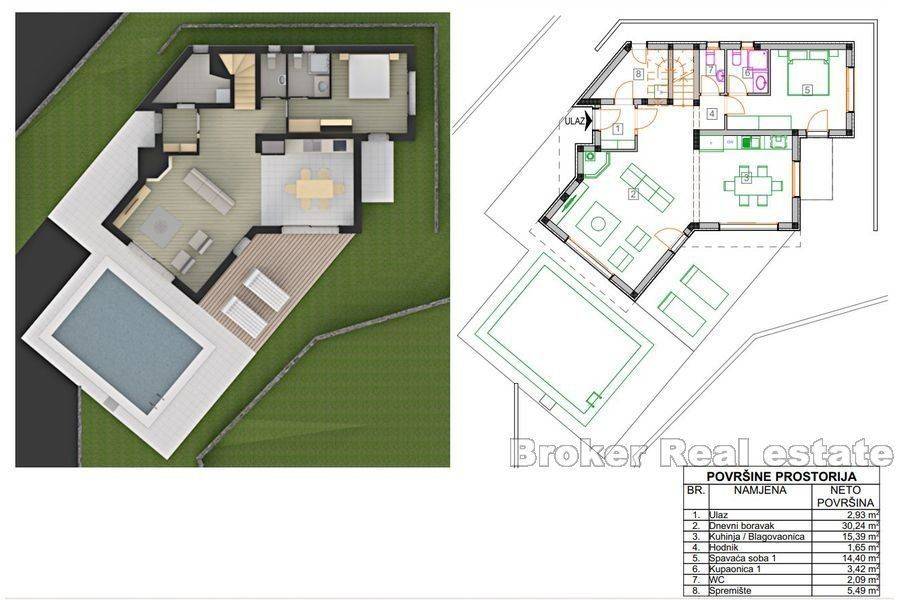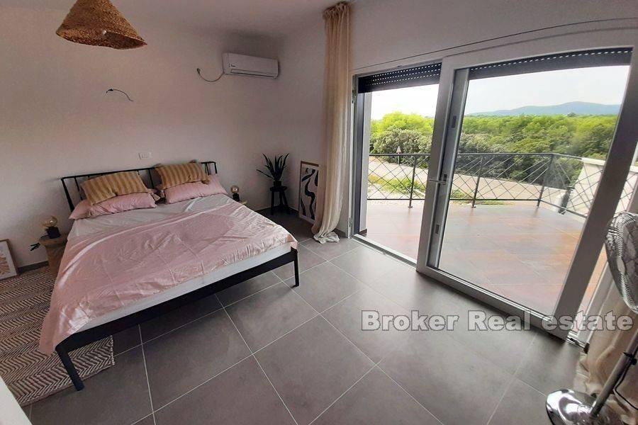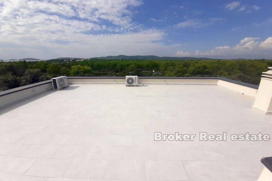 An elegant small villa with a swimming pool, for sale, located near the Solaris hotel complex and the town of Šibenik. The villa is a newly constructed, located on a plot of 480 m2, with a total living area of 200 m2. The property consists of a ground floor, a first floor and a roof terrace. On the ground floor there is a living room with an open-concept kitchen and dining room, a bedroom with an en-suite bathroom, a guest toilet and a storage room where the laundry room and technical equipment of the house are located. On the first floor there is a bathroom and three bedrooms, of which the main bedroom has an en-suite bathroom and a terrace, and the room to the east has its own balcony. On the first floor, there is an external exit to the roof terrace where the installations for the jacuzzi and the summer kitchen have been carried out. There is a view of the sea from the roof terrace. The grounds of the villa contain a small cultivated garden and a swimming pool. There are several parking spaces in front of the property. Considering its position in a quiet neighborhood, and the proximity of the Solaris hotel complex and the town of Šibenik, this offer represents a quality investment on this part of the coast.