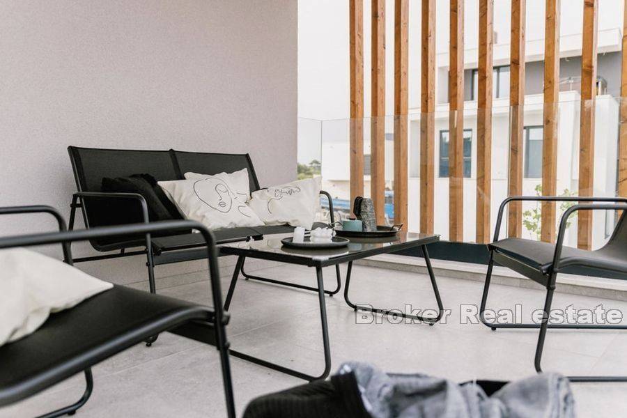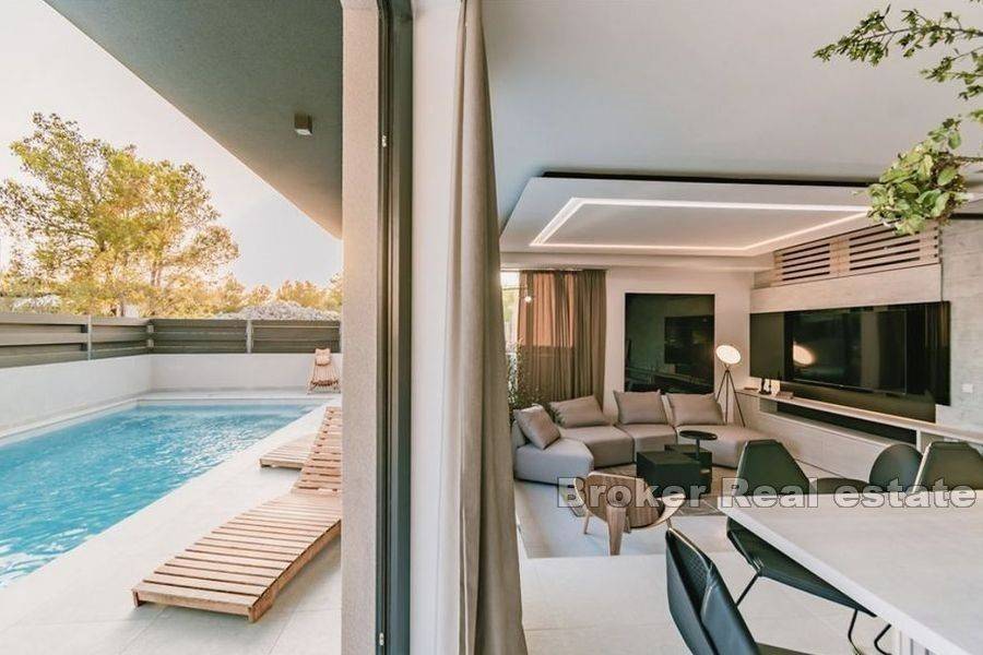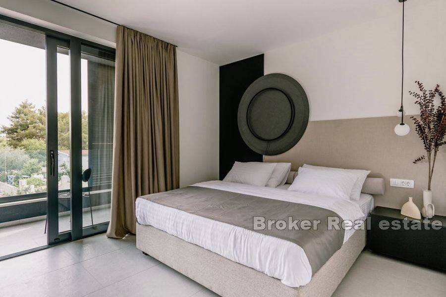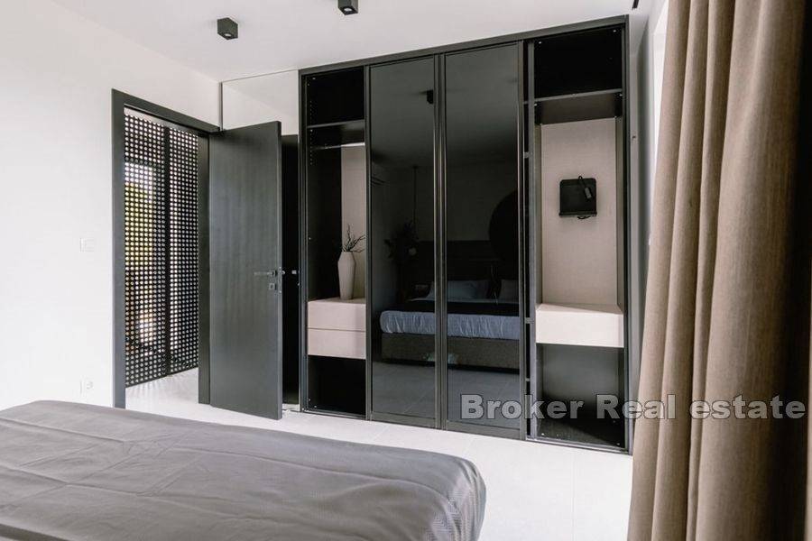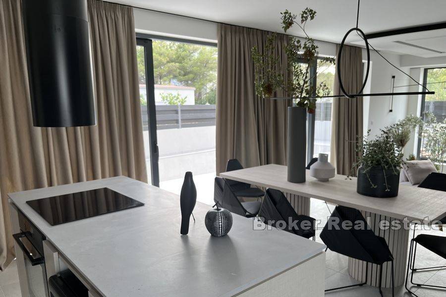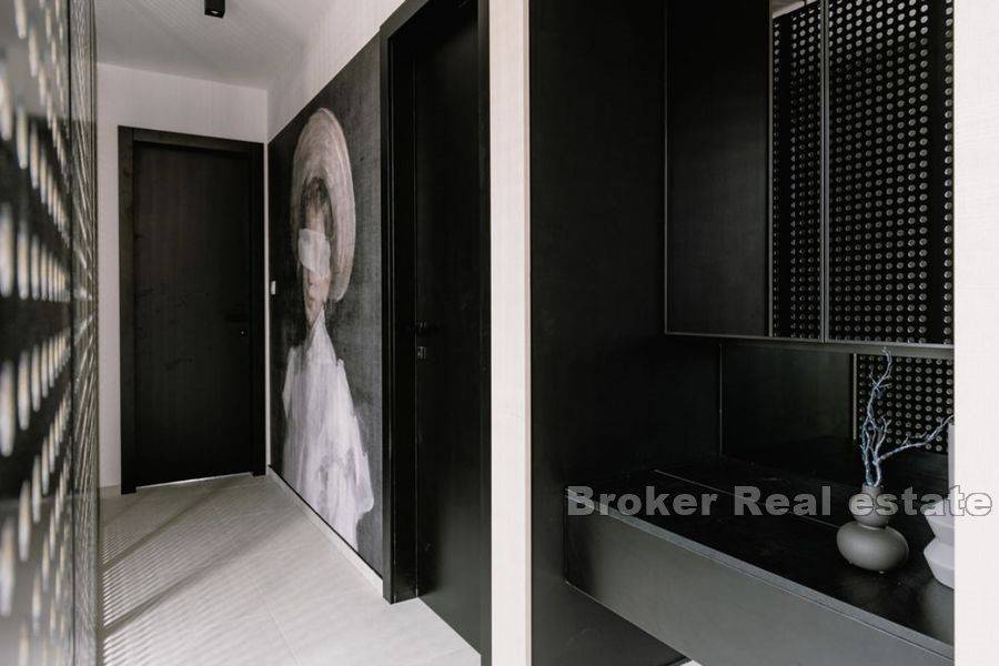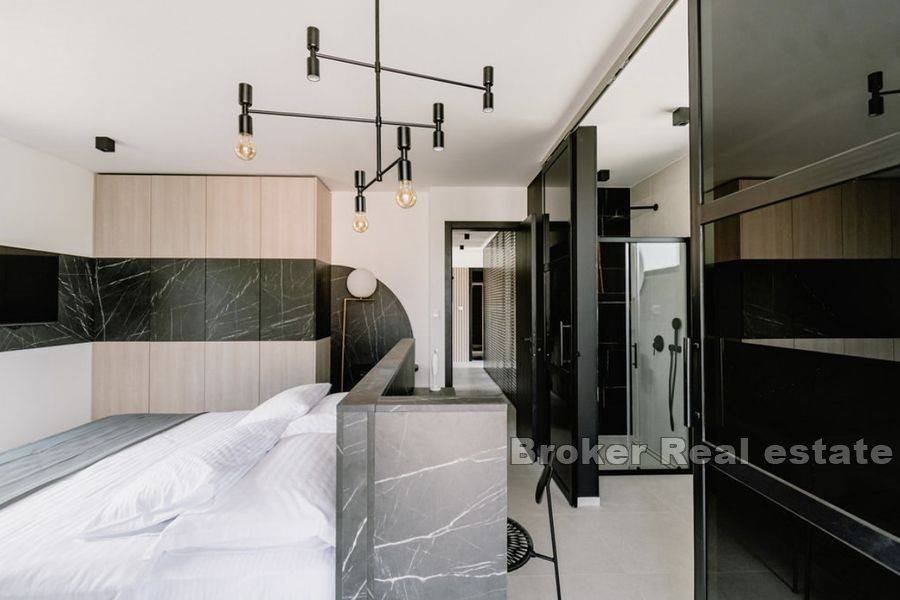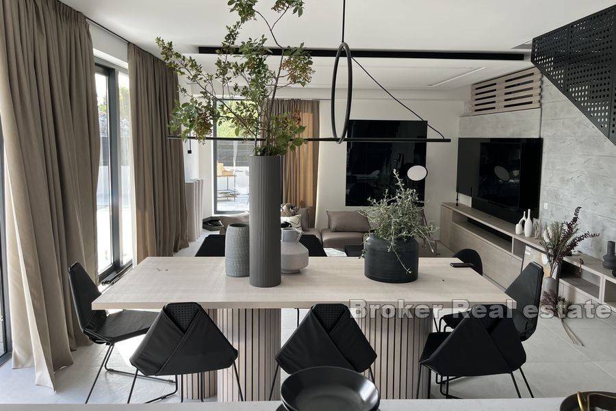 Property of extraordinary design in Vodice. The house with an unusual layout of 200 m2 is located on a plot of 400 m2, which is maximally used with additional facilities surrounding the property. The yard of this interesting property consists of 2 private closed parking spaces and two more spaces outside the garden walls. Rich horticulture, a sundeck, a jacuzzi, a pool over 10 meters long and a barbecue, truly create a compact whole that surrounds the property itself. The interior of the house is designed on clean lines and simplicity with earthy tones and black details. The railing of the black steel staircase extends from the ground floor to the ceiling of the second floor, which really gives the house its character. From the main entrance to the property, you enter the common area where the kitchen and dining room are located, as well as the smaller stairs that separate these two areas from the living room. The entire length of the first floor of the property offers the possibility of exiting to the terrace with a swimming pool through movable glass walls. In addition to the main rooms, there is another bedroom on the ground floor with direct access to the terrace, as well as a shared toilet and additional space. Lighting in the house is provided by LED lamps and light inside the wardrobe, which adds to the depth of the space. An interesting staircase leads to the upper floor of the property where there are 3 bedrooms. There is also an integrated sauna in the second shared bathroom. Each bedroom on the first floor has access to a balcony that is protected by movable blinds. Also, on the first floor there is a master bedroom with its own bathroom and exit to the balcony. The side frame on the balcony is protected by wooden beams, which gives the exterior a visual luxury impression. Given that the property was built by top architects and professional interior designers, it can truly be said that it is a unique property in which much more than money has been invested. In addition to the appearance and the possibilities that the property provides, the location also adds a big plus.