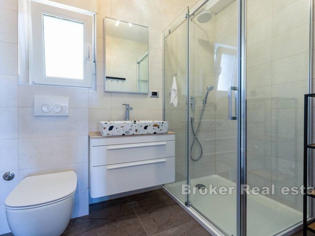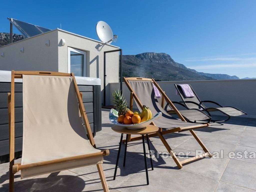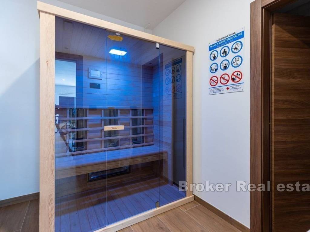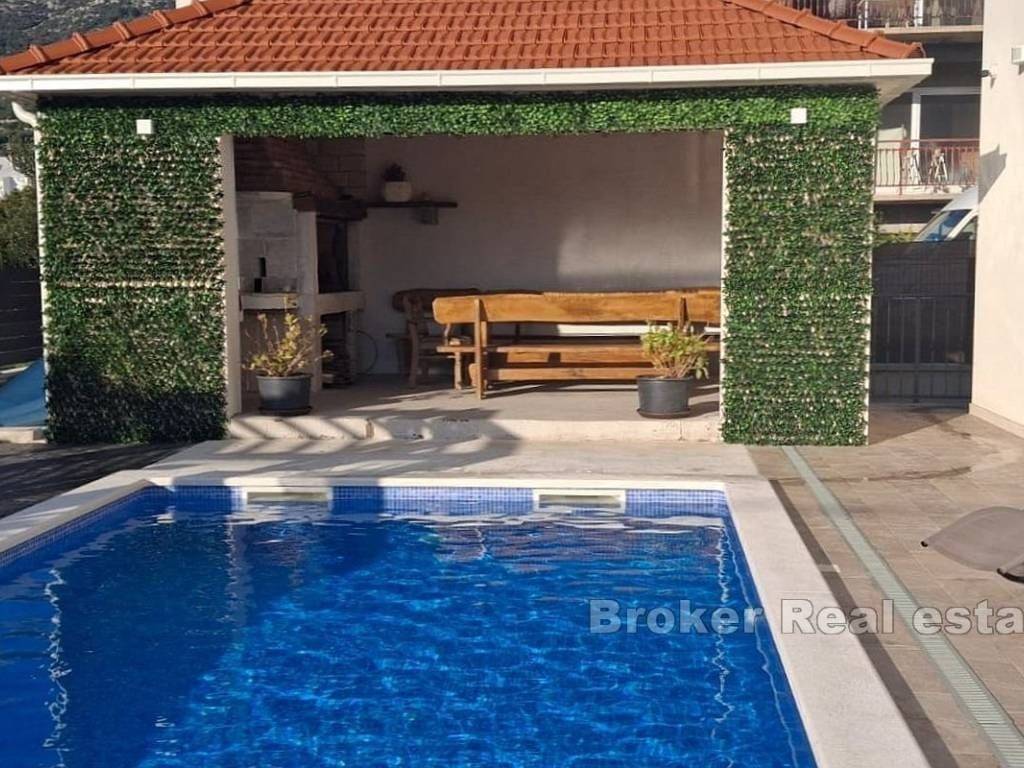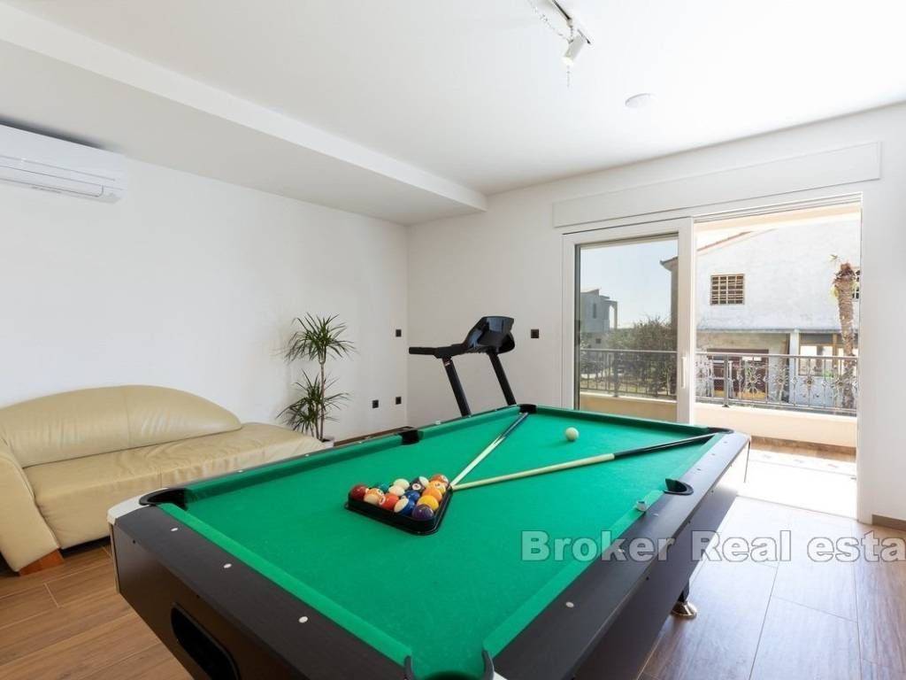 We present to you a beautiful and modernly equipped villa located in Kaštela, which offers the perfect combination of luxury, comfort and functionality. This impressive property extends over a living area of 300 m² and is located on a landscaped plot of 500 m². Ideal for tourist rental, as well as for year-round living, this villa is only 900 meters from the sea, and its numerous amenities are complemented by a peaceful and attractive environment. The basement of the house contains a technical room and a spacious storage room, making it ideal for organizing and maintaining household appliances and storing them. This space ensures optimal functionality and practicality. The ground floor of this luxury villa is designed as a zone for relaxation and socializing. It contains: A sauna for complete relaxation, a gym for active lifestyle enthusiasts, a games room, perfect for entertaining all generations, a modern kitchen, connected to the living area, which opens onto a spacious balcony and terrace. On the terrace there is a swimming pool surrounded by sun loungers, an outdoor barbecue with a summer kitchen and an outdoor dining area, creating the perfect place to enjoy long summer evenings. The first floor offers plenty of space for everyday life and includes: two spacious bedrooms, an elegantly decorated living room, a fully equipped kitchen, a bathroom and a separate toilet, a storage room for additional organization, a spacious balcony, which provides an intimate place to enjoy your morning coffee. The second floor is perfect for larger families or guests. This space includes: three comfortable bedrooms, a living room, a kitchen, a toilet, a balcony with panoramic views of the surroundings. The top floor of this villa hides a spacious roof terrace with a luxurious jacuzzi, from which a spectacular and open view of the sea is offered. This space is ideal for relaxing under the stars or enjoying unforgettable sunsets. The villa is equipped with top-notch equipment to ensure maximum comfort and safety: solar panels for water heating, air conditioning in all rooms, outdoor video surveillance, outdoor shower, barbecue with summer kitchen, all modernly furnished interior and exterior. This unique property exudes sophistication and style, combining superior functionality, spaciousness and luxury. Located in an attractive location in Kaštela, it offers everything you need for luxurious family life or as an exceptional investment for tourist rental. Don’t miss the opportunity to become the owner of this luxurious villa that perfectly combines modern design, natural beauty and practicality!