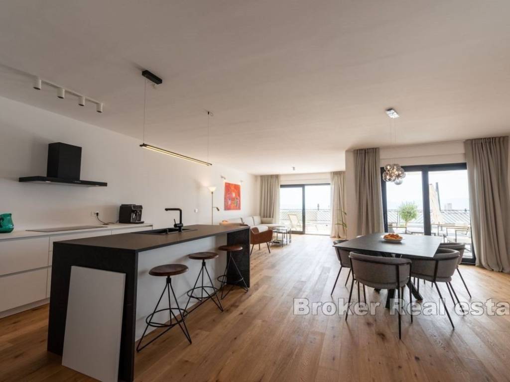 A sophisticated semi-detached villa with an open sea view is for sale. The total living area of 208.70 m2 consists of three floors. In the basement there is a garage and a storage room equipped with a gas boiler, a washing machine and a clothes dryer. The internal stairs lead to the ground floor, which consists of an entrance hall, an open space that unites the living room, kitchen and dining room, making it ideal for family gatherings and socializing with loved ones. There is also a practical guest toilet on this level. Through the living room, there is access to a sunny terrace with a heated pool and deck chairs, providing the ultimate space for relaxation with a view. The first floor consists of a master bedroom with its own bathroom and walk-in closet. Two additional bedrooms and a modern bathroom complete the first floor, along with a covered terrace from which you can enjoy a panoramic view of the sea and the beautiful Kvarner. This villa offers the ideal blend of elegance, convenience and green scenery, making it the perfect seaside retreat.