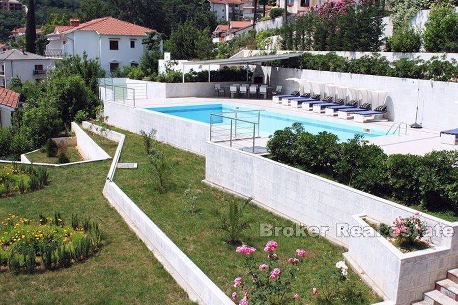 Situated in Icici, at the edge of glorious Opatija, in calm and green area and just 150 m from the beach and marina with yachts, this exclusive Villa is only 2 km from center of Opatija. This unique Croatian villa represents an impressive modern design and one of the finest examples of a contemporary Croatian architecture. Just marble walls around the villa are great value per se. Villa has 4 floor levels. Three upper levels contain 3 huge apartments, each around 190 m2. Every apartment has large hall with imperial white, labrador blue pearl and red africa granite in different design; impressive loggia with red africa granite, elegant dining set and spectacular view to the sea; superior kitchen/dining room with imperial white, labrador blue pearl and red africa granite again in different design and all modern appliances and equipment; exceptional living room with the same granite in different design, home cinema and elegant pure leather sofa set; master bedroom with king size bed, machagony parquet and view to the see; comfortable bedroom with queen size bed and machagony parquet; two twin size bedrooms with machagony parquet; one extraordinary bathroom in natural onyx with Jacuzzi; one bathroom in splendid ceramic with steam-bath; separate WC and wardrobe room. All furniture is brand new. Basement, the first level, on 140 m2 contains an small wellness center with sauna, shower and massage table, spacious gym, large recreational room with billiard and ping pong table and space for central heating equipment. All that belongs for use to each apartment. There are also three separate small spaces for every apartment. The luxury Villa, on 2500 m2, has also a spacious private swimming pool 13×6 m with extensive terrace, remarkable sun loungers, dining space and panoramic view to the sea, big garage for 6 cars, impressive Mediterranean garden with more than 500 flowers and trees and nice playground for basketball and mini football. Everything belongs for use to each apartment. It is possible either to buy the whole Villa or a single apartment (one of three). There are about 900m2 of living space when the pool and a garage is included. Please contact us for pricing and more information.