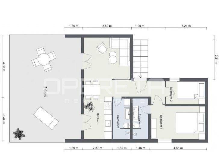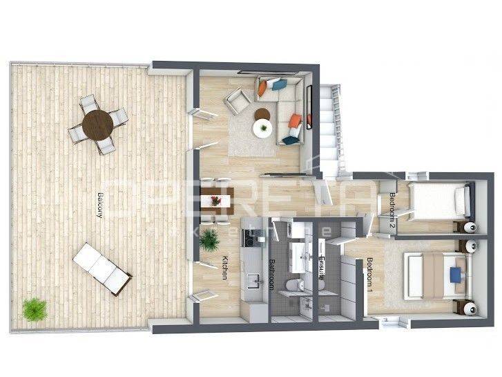A spacious living room, kitchen, 2 bedrooms and 2 bathrooms extend over 51.42 m², and the biggest advantage is the 31.80 m² terrace with a beautiful, unobstructed view of the sea. The apartment has a loggia, staircase, storage room, as well as a secured parking space.