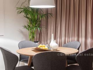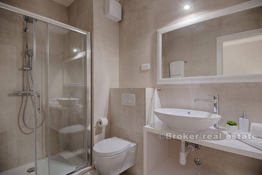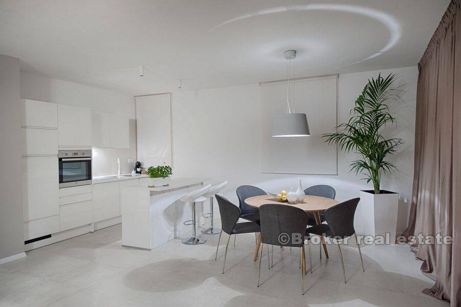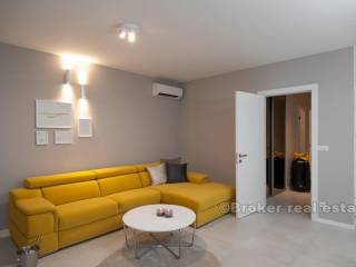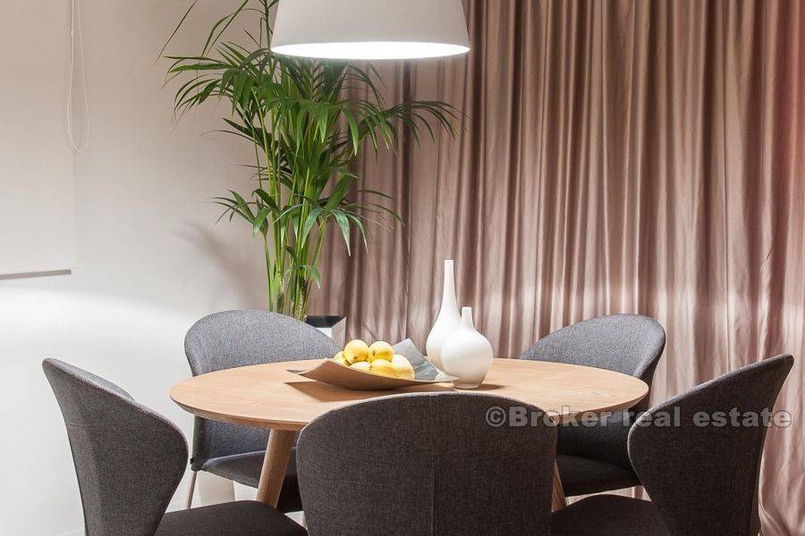 Beautiful, modern furnished apartment with enchanting view of the sea and Dalmatian islands. It has 80 m2 and consists of two bedrooms, two bathrooms, one toilet, spacious living room and a kitchen with dining room. The main advantage is a large balcony with its own sitting area where you can enjoy most of the year. The apartment is fully and luxuriously equipped. It also has parking space in garage, from where you can come directly to the apartment. The apartment is south oriented, close to the Žnjan beach, promenades, restaurants, shops and other important contents. * Considering the volatility and dynamics of renting, the ad is informative and does not necessarily mean that this apartment is available for rent. For current information, please contact us.