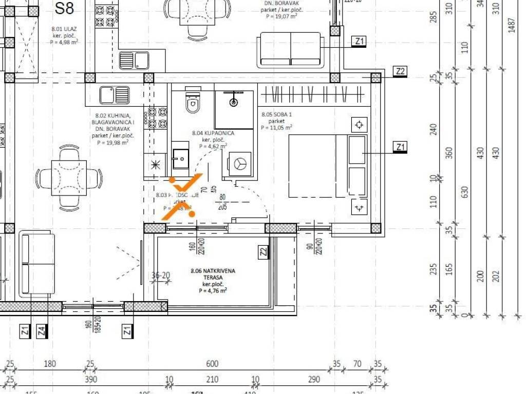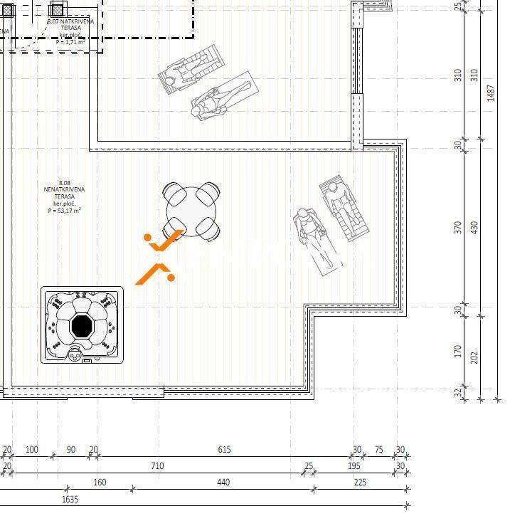 An attractive penthouse in a new development is for sale in the Bili Brig neighborhood of Zadar. Located on the 2nd floor of a residential building, this apartment includes a private rooftop terrace with a sea view, a storage room, and two parking spaces. The property is 2,6 km from the sea and 2,8 km from the city center.The layout includes a hallway, a bedroom, a bathroom, a kitchen with dining area and living room, and a covered terrace (net 45,49 m²). From the shared staircase, access leads to a rooftop terrace of 54,88 m², partially covered.The net usable interior area is 59,64 m². In addition, the apartment includes a storage room of 3,26 m² (net 1,63 m²) and two outdoor parking spaces. The total net usable area including all associated parts is 66,76 m².