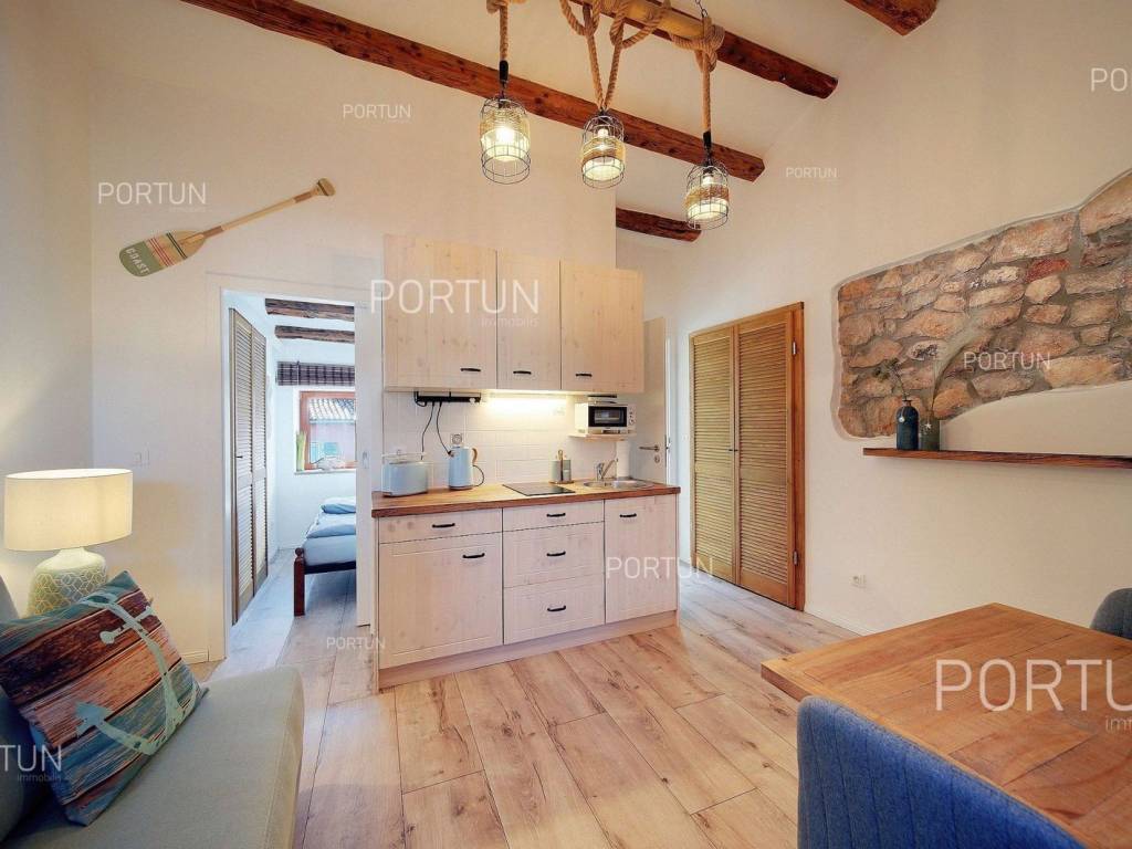 Freshly decorated apartment in the center of Rovinj, is a pleasant summer oasis for two guests looking to explore the charms of the old town. The interior, executed in a combination of white surfaces and wooden elements, is harmoniously complemented by various decorations and original lighting inspired by the fishing tradition of Rovinj. The flat measures approx. 23 sqm. The flat offers sea view from the living room window. The flat is sold fully equipped, and the new buyer only has to bring along personal belongings. This flat, restored in 2022 is arranged in a house which was built in the late 19th century. The house comprises three apartments. The house has ground floor and three floors above ground. Floors are connected by wooden internal stairs. The massive load-bearing walls are made of stone. Wooden floor stucture. Timber roof structure. Pitched roof covered with clay tiles. LocationDistance to the closest highway entry (Kanfanar) amounts to 14 km. The closest international airport Pula is 39 km away. Distance to other cities: Bale 13 km, Poreč 36 km, Trieste 117 km, Ljubljana 187 km and Zagreb 251 km. LayoutThe flat includes a living room with kitchen and dining room, a bedroom and a bathroom. The flat is facing east. Heating and coolingThe flat is fitted with inverter air conditioner and electric hot water boiler. Architectural joinery and equipmentThis flat is fitted with external wooden joinery. Lighting, intercom and sanitaryware. Floor coveringsCeramic tiles are laid in the bathroom, while in other spaces is fixed laminate flooring. FurnitureThe flat comes with furniture and fully equipped kitchen. Parking spaces and particlesThe flat is situated in the city center, where there is limited access to motor vehicles. The nearest public parking area is 400 m away. InfrastructureThe access road is paved with stone. House is connected to the city sewage system. The flat has an electricity supply, a water supply and a satellite TV antenna.