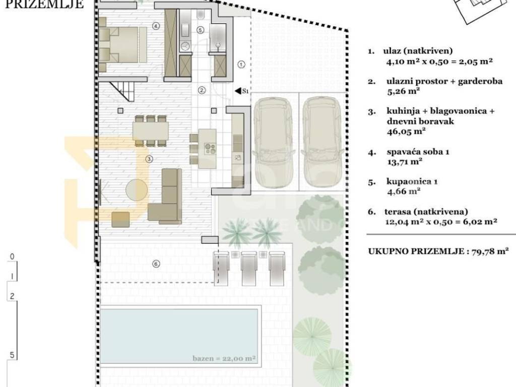 Apartment S1, with a total net size of 217.90 m2, spreads over two floors. The total living area size, including the corresponding terraces, is 175 m2. On the ground floor, with an area of 78.79 m2, there is a kitchen with dining area, a large living room, a bedroom, a dressing room, and a bathroom. The living room leads to a beautiful garden with a covered terrace and a pool.