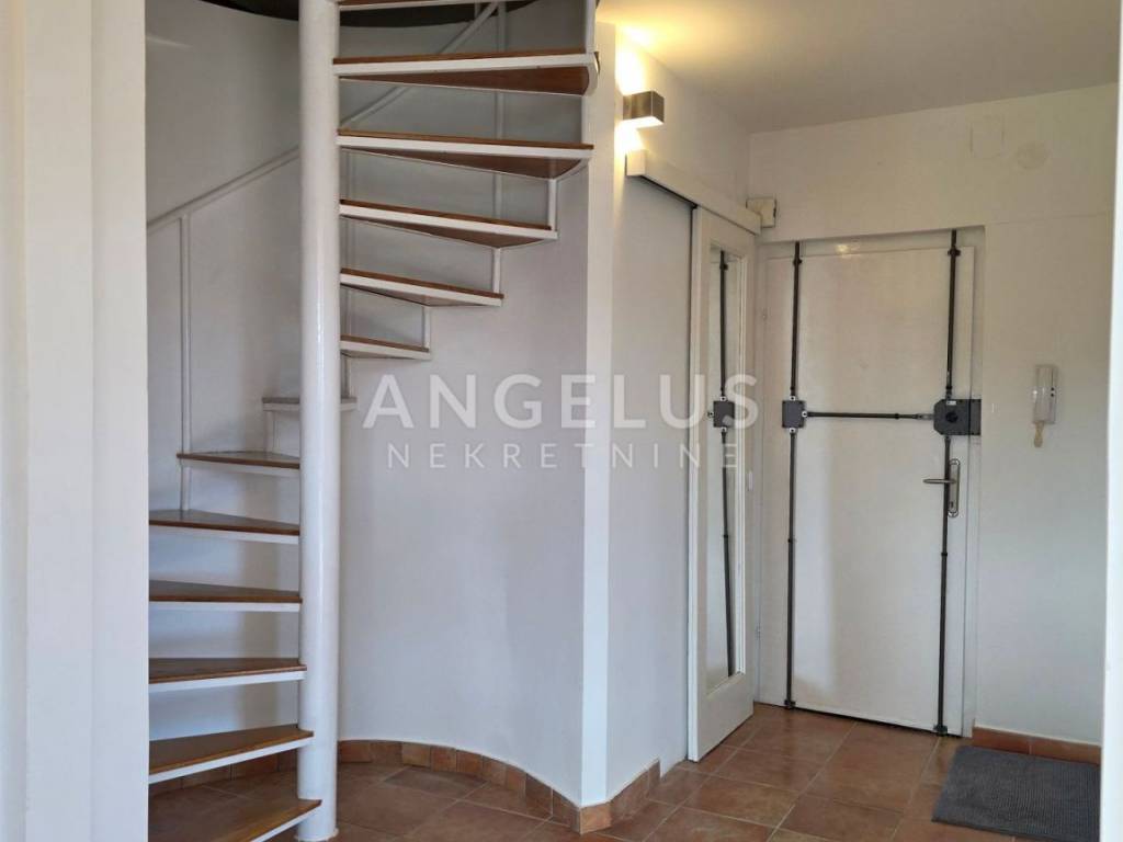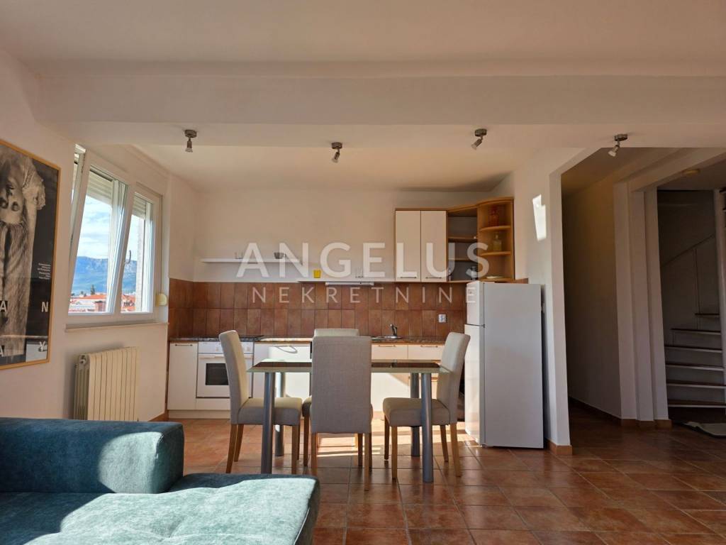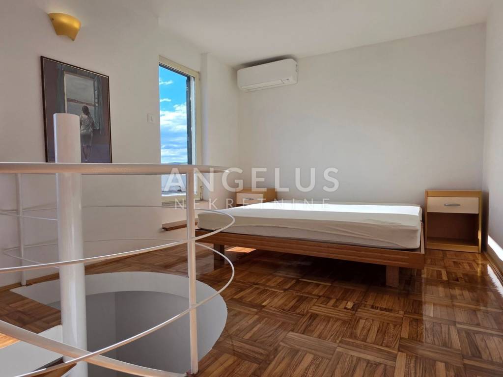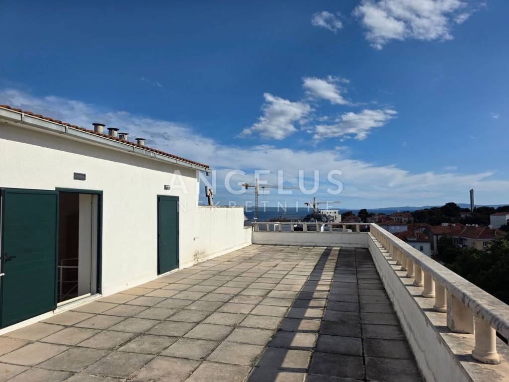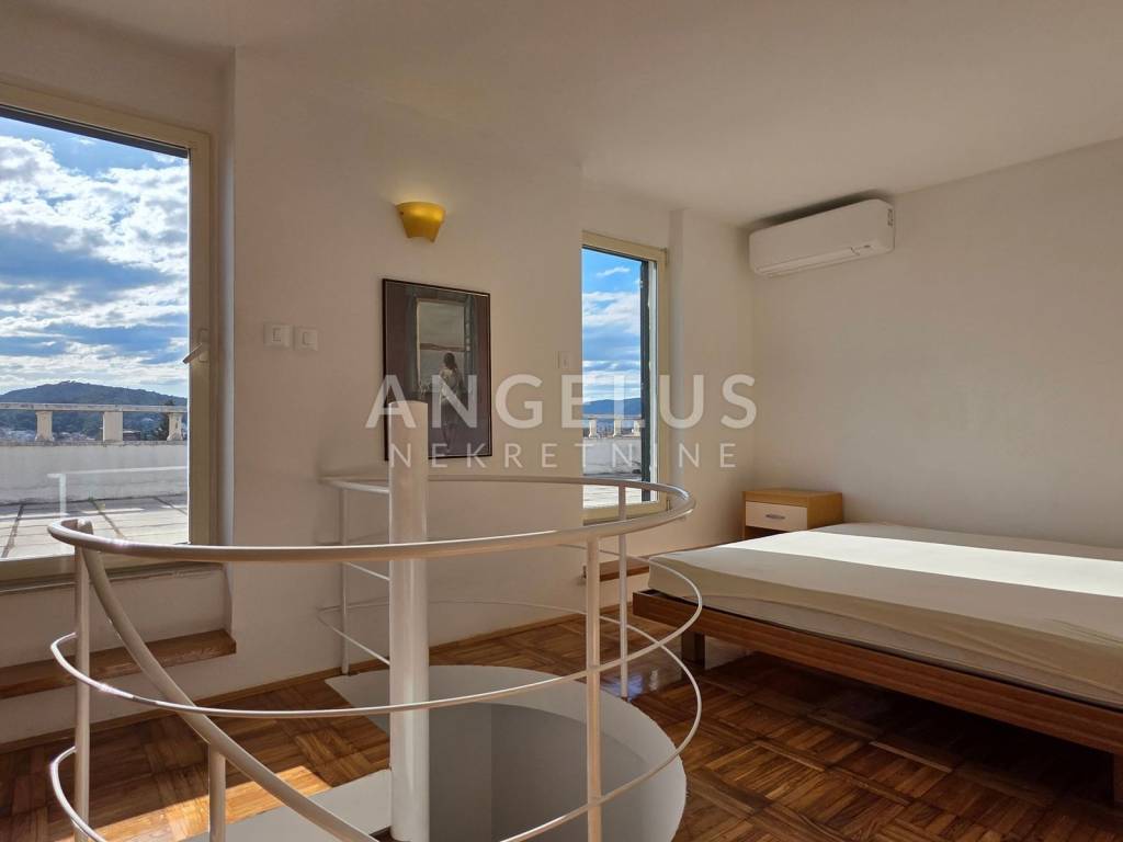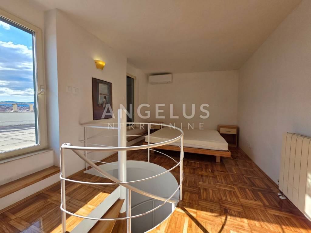 This spacious two-story apartment with a total area of 85 m2 is located on the 4th floor of a residential building with an elevator. On the lower floor there is a living room with a kitchen and dining room, one bedroom, a bathroom, a pantry, a small toilet and a loggia to the south. Internal stairs lead to the upper floor where the second bedroom is located. From this room you can exit to the roof terrace with an incredible view of the city, Marjan and the islands!