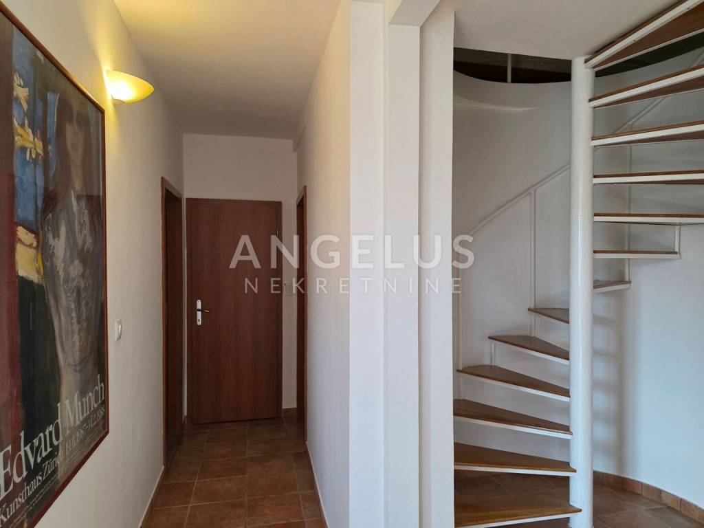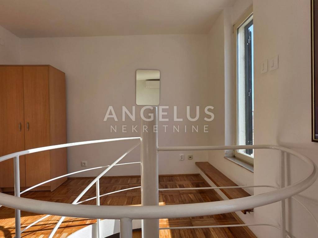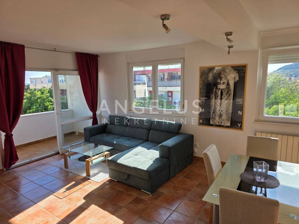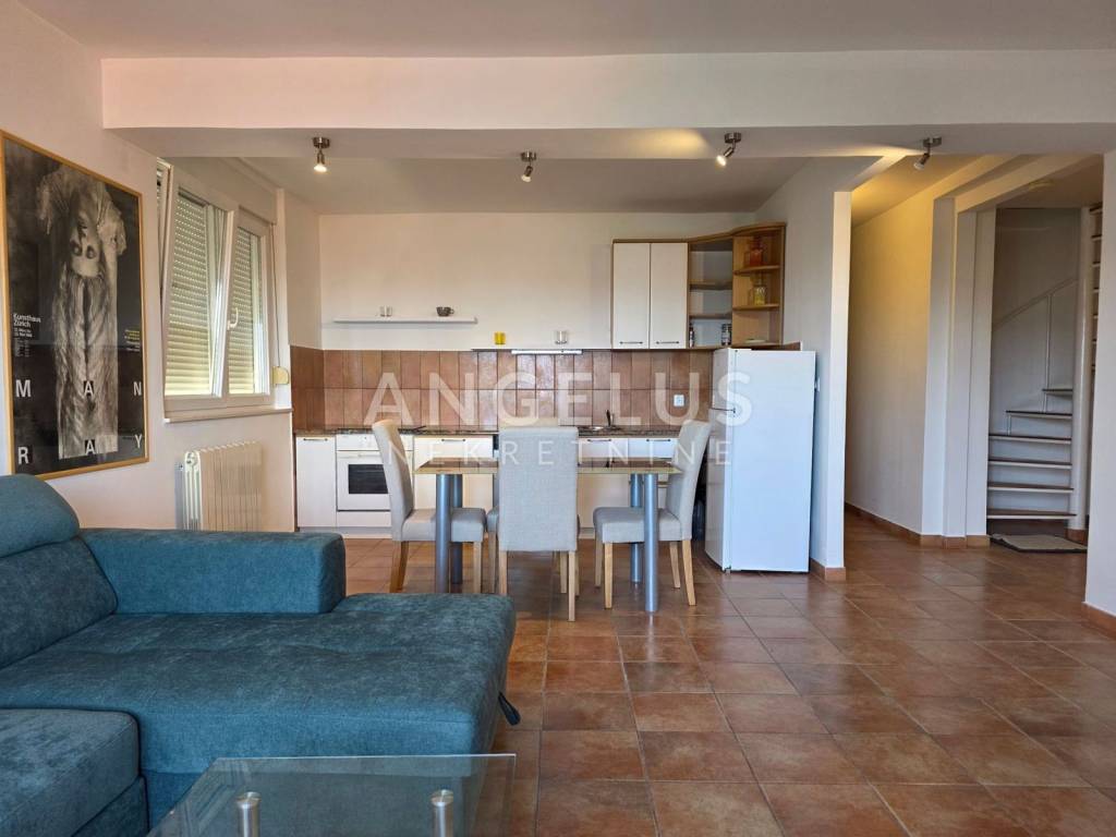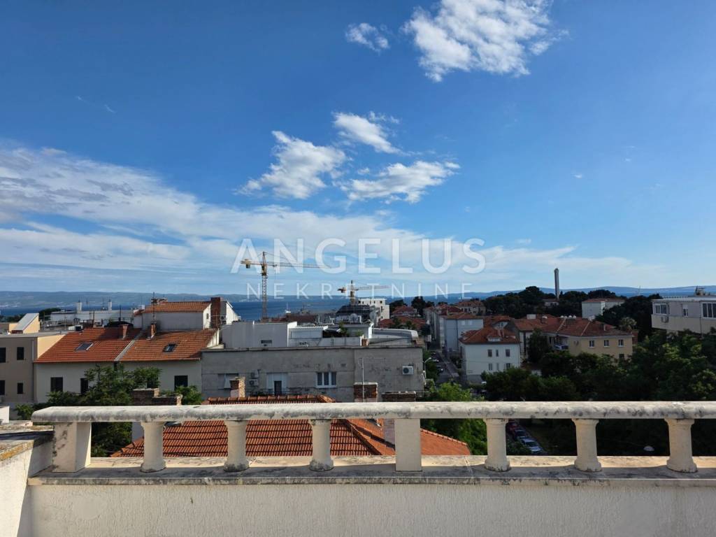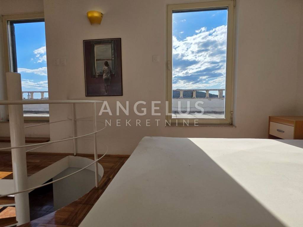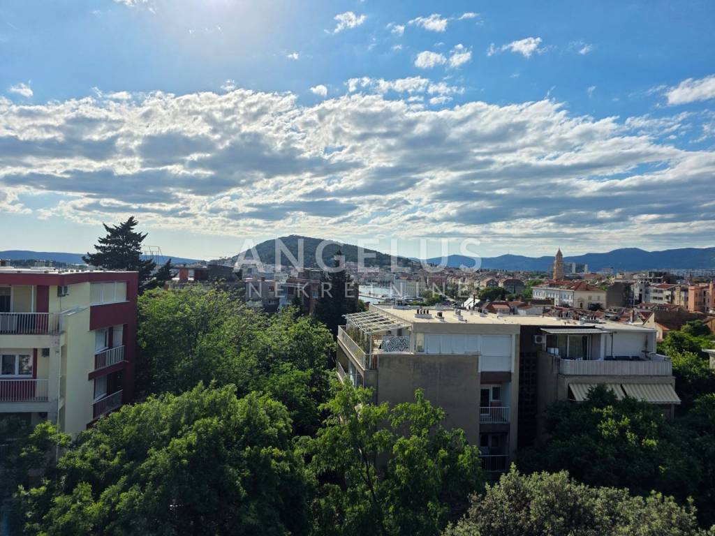 This spacious two-story apartment with a total area of 85 m2 is located on the 4th floor of a residential building with an elevator. On the lower floor there is a living room with a kitchen and dining room, one bedroom, a bathroom, a pantry, a small toilet and a loggia to the south. Internal stairs lead to the upper floor where the second bedroom is located. From this room you can exit to the roof terrace with an incredible view of the city, Marjan and the islands!