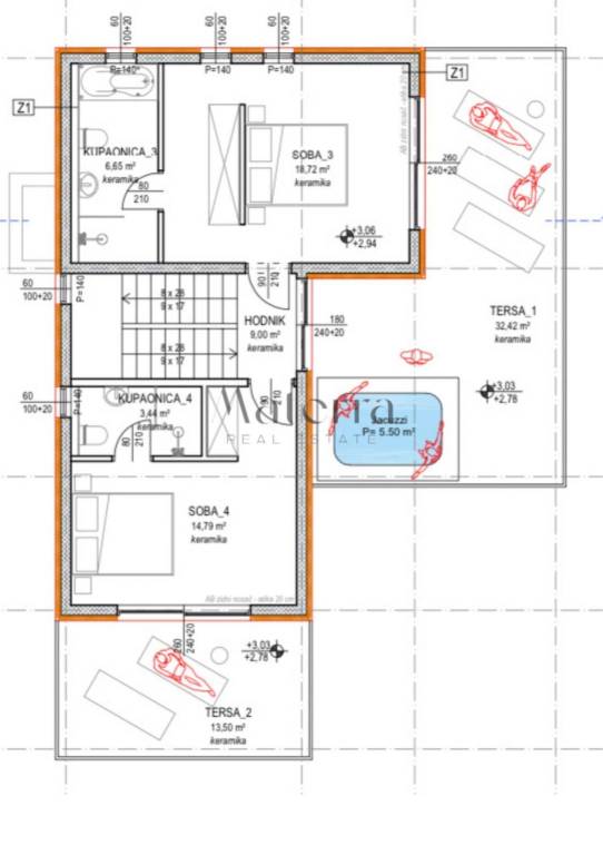 First floor: 2 bedrooms, each with its own bathroom and terrace.