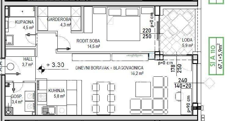 Prodaje se stan površine 67,1 m2 s lođom površine 5,9 m2 na 1. katu niskoenergetske stambeno – poslovne zgrade na odličnoj lokaciji. Zgrada se sastoji od podruma, visokog prizemlja, prvog, drugog i trećeg kata te sadrži ukupno 74 stambene jedinice i 7 poslovnih prostora. Završetak gradnje predviđen je krajem 2025./početak 2026. Energetski razred je A+. Moguć je odabir podnih obloga (keramika, parket ili laminat) te odabir unutarnje stolarije. Uz stan moguća je kupovina i vanjskog parkirnog mjesta po cijeni od 8.000,00 EUR, garažnog mjesta bez spremišta po cijeni od 14.000,00 EUR, garažnog mjesta sa spremištem do 17,4 m2 po cijeni od 17.500,00 EUR, garažnog mjesta sa spremištem do 19,4 m2 po cijeni od 19.500,00 EUR ili garažnog mjesta sa spremištem do 20,6 m2 po cijeni od 22.500,00 EUR.