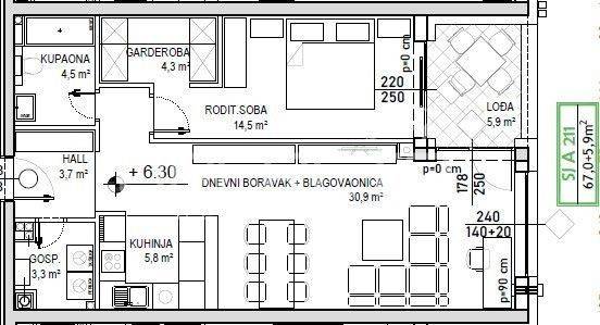 Prodaje se stan površine 67,0 m2 s lođom površine 5,9 m2 na 2. katu niskoenergetske stambeno – poslovne zgrade na odličnoj lokaciji. Zgrada se sastoji od podruma, visokog prizemlja, prvog, drugog i trećeg kata te sadrži ukupno 74 stambene jedinice i 7 poslovnih prostora. Završetak gradnje predviđen je krajem 2025./početak 2026. Energetski razred je A+. Moguć je odabir podnih obloga (keramika, parket ili laminat) te odabir unutarnje stolarije. Uz stan moguća je kupovina i vanjskog parkirnog mjesta po cijeni od 8.000,00 EUR, garažnog mjesta bez spremišta po cijeni od 14.000,00 EUR, garažnog mjesta sa spremištem do 17,4 m2 po cijeni od 17.500,00 EUR, garažnog mjesta sa spremištem do 19,4 m2 po cijeni od 19.500,00 EUR ili garažnog mjesta sa spremištem do 20,6 m2 po cijeni od 22.500,00 EUR.