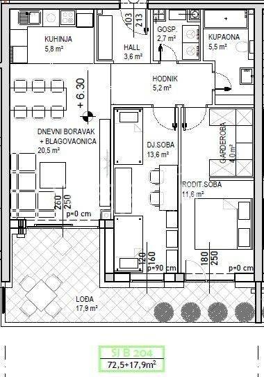 Prodaje se stan površine 72,5 m2 s lođom površine 17,9 m2 na 2. katu niskoenergetske stambeno – poslovne zgrade na odličnoj lokaciji. Zgrada se sastoji od podruma, visokog prizemlja, prvog, drugog i trećeg kata te sadrži ukupno 74 stambene jedinice i 7 poslovnih prostora. Završetak gradnje predviđen je krajem 2025./početak 2026. Energetski razred je A+. Moguć je odabir podnih obloga (keramika, parket ili laminat) te odabir unutarnje stolarije. Uz stan moguća je kupovina i vanjskog parkirnog mjesta po cijeni od 8.000,00 EUR, garažnog mjesta bez spremišta po cijeni od 14.000,00 EUR, garažnog mjesta sa spremištem do 17,4 m2 po cijeni od 17.500,00 EUR, garažnog mjesta sa spremištem do 19,4 m2 po cijeni od 19.500,00 EUR ili garažnog mjesta sa spremištem do 20,6 m2 po cijeni od 22.500,00 EUR.