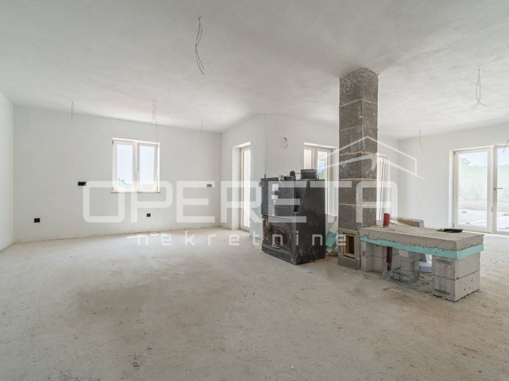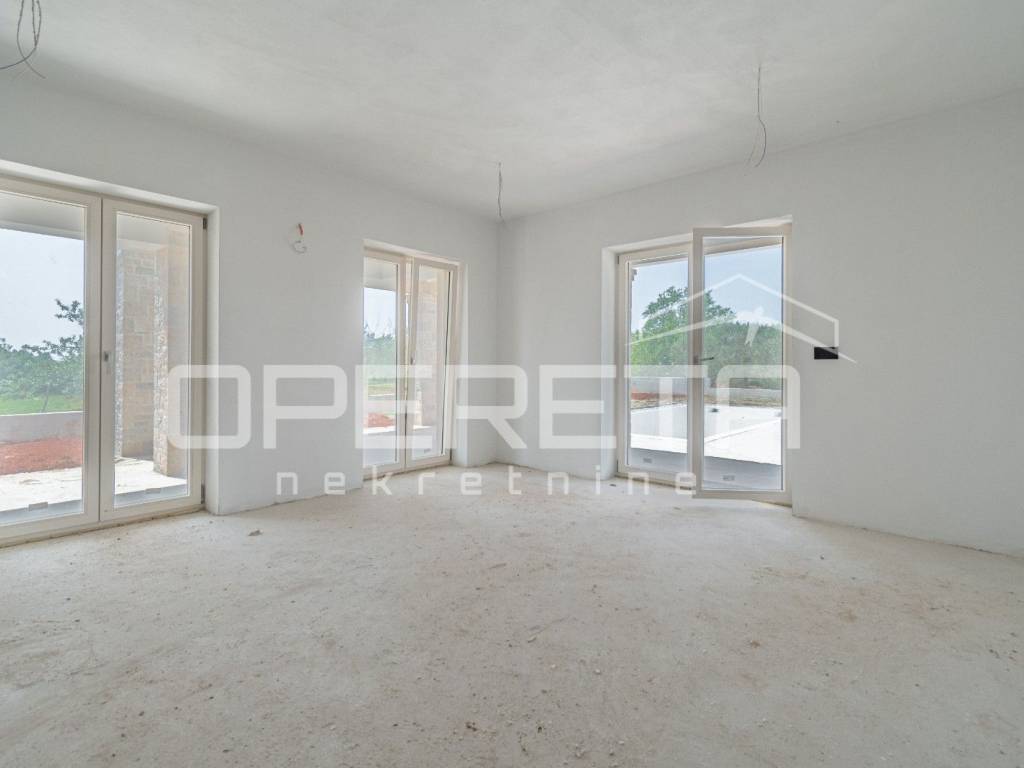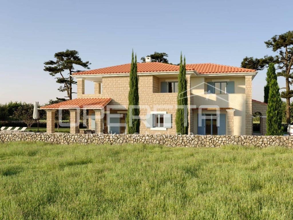 From the living room and kitchen, there is access to a large covered terrace of 35m2, which is decorated with stone walls and stone columns in the Istrian style, from the terrace you can access the courtyard and the 40 m2 swimming pool and sunbathing area.