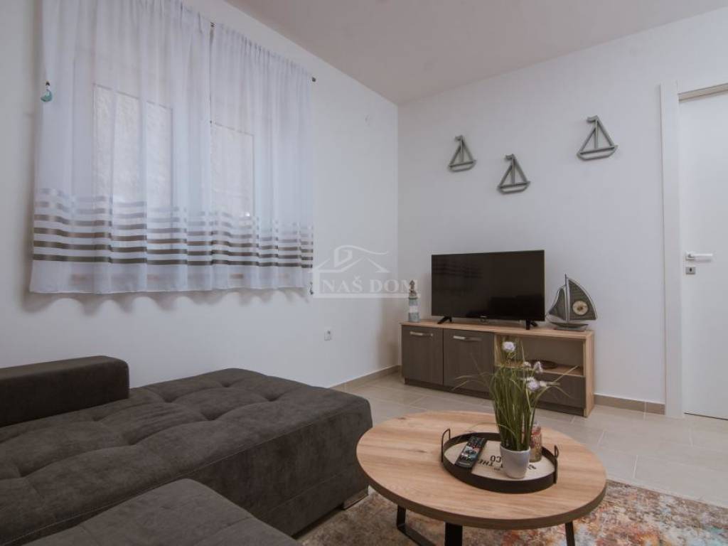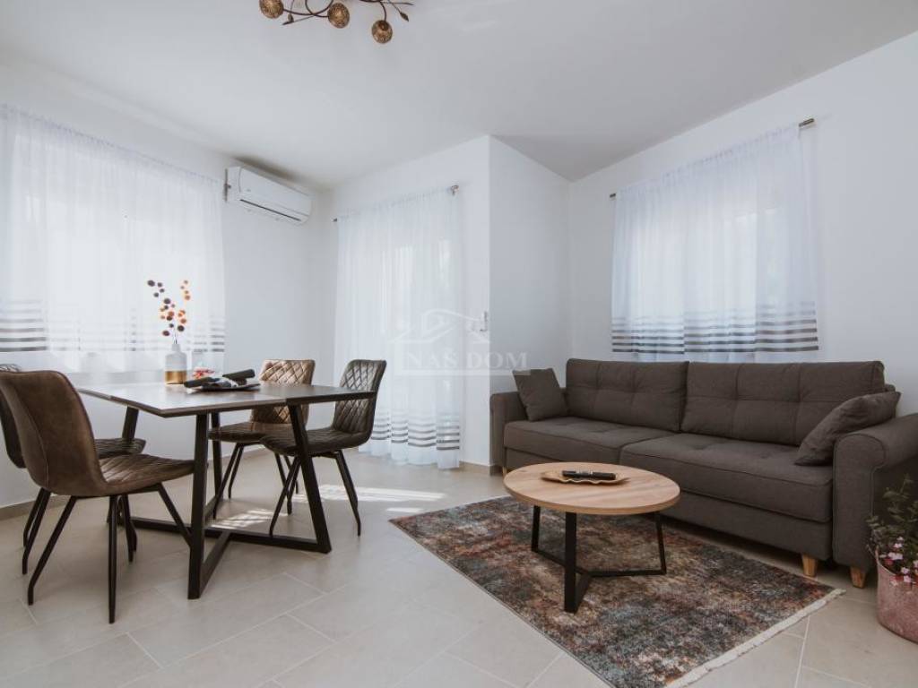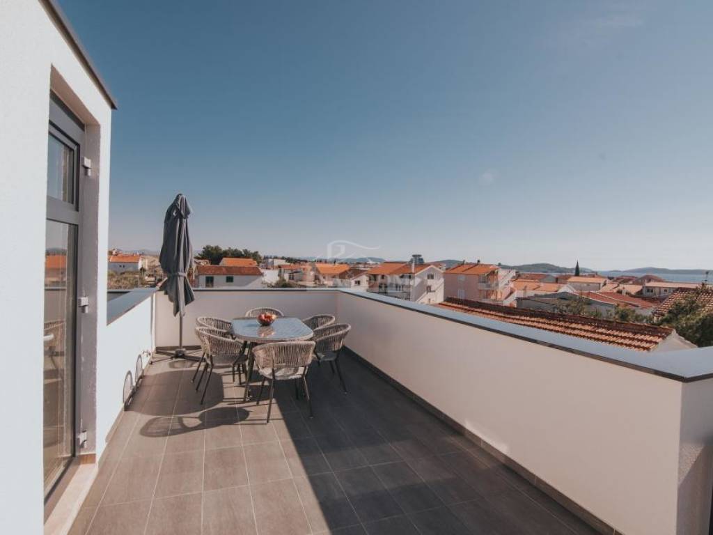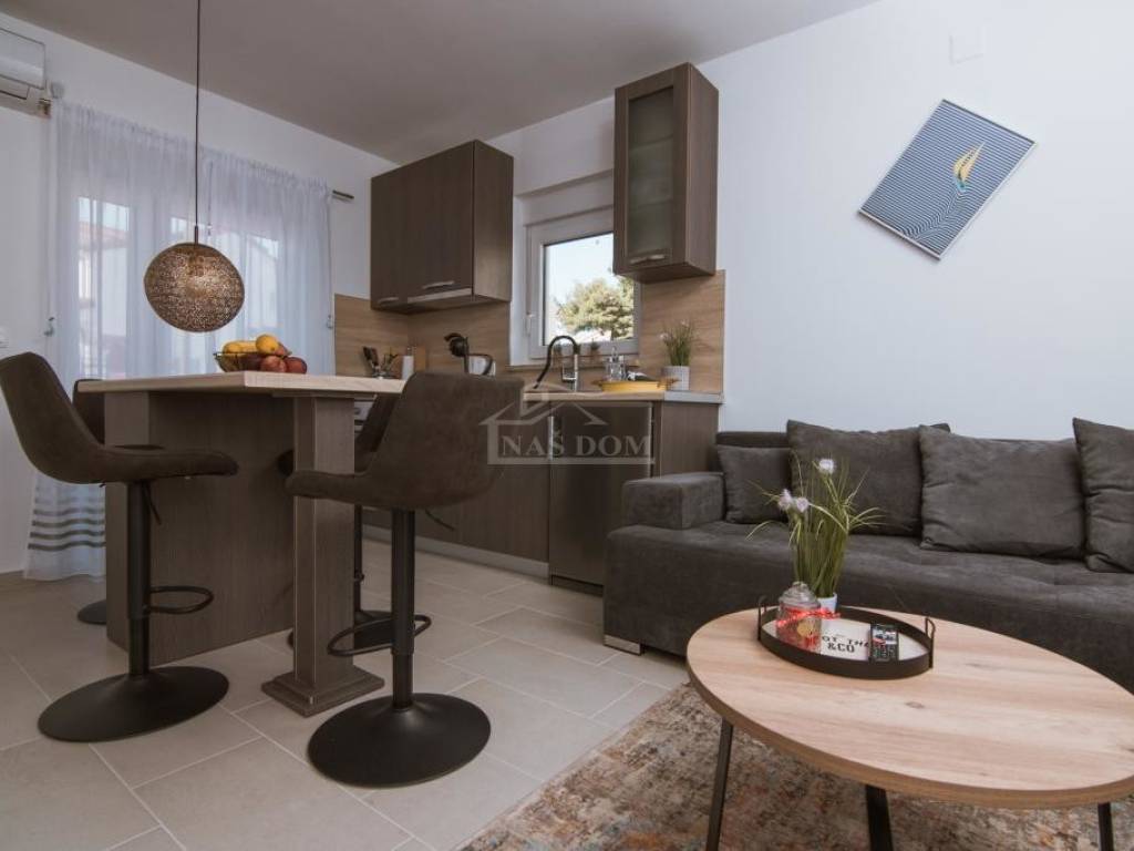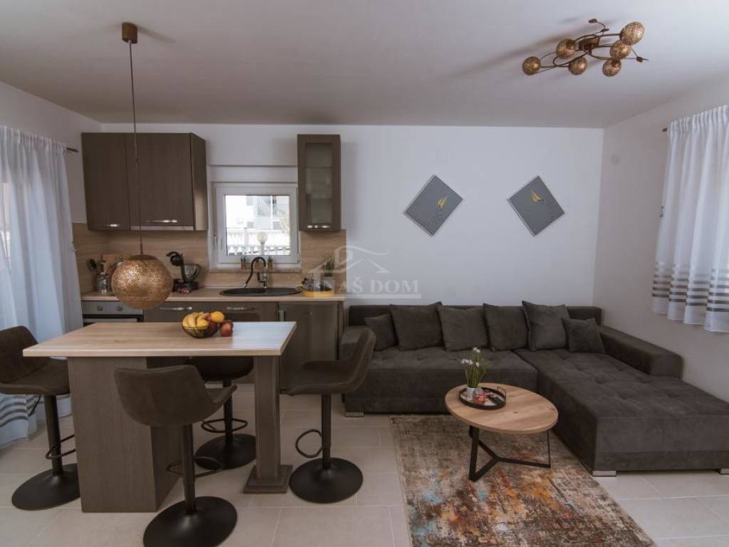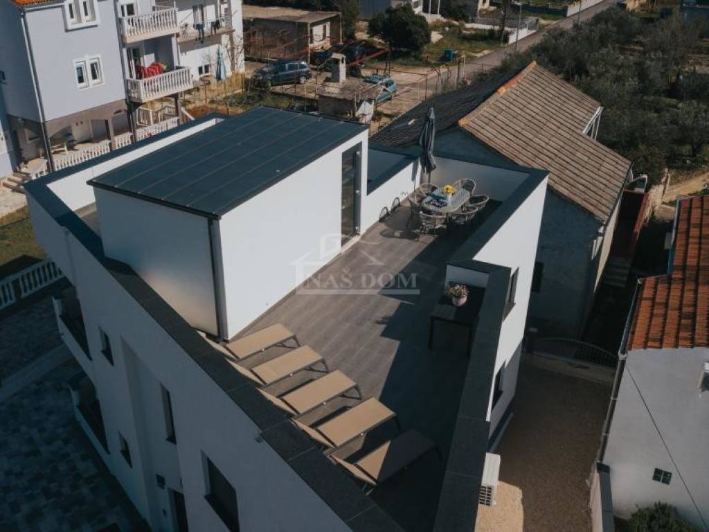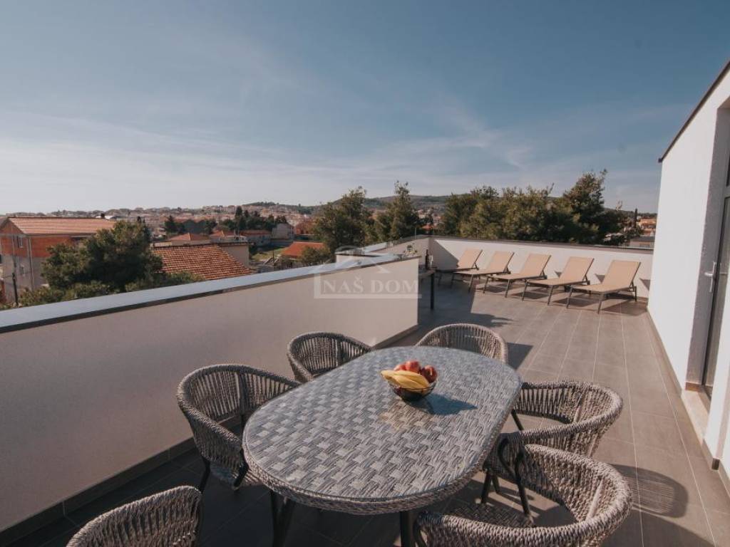 Vodice - for sale is a modern-looking detached house built in 2016. The house has a footprint of 97m2 and a total gross building area of 220m2, consisting of three levels: ground floor + upper floor + roof terrace. The house actually has a total of 4 apartments; two on the ground floor and two on the upper floor. All apartments consist of an entrance, a bedroom, a bathroom, a kitchen with a dining area, a living room, and a terrace. The apartments are air-conditioned and furnished with modern furniture.