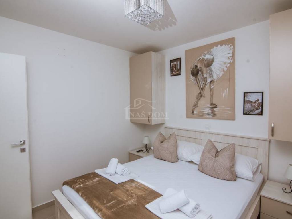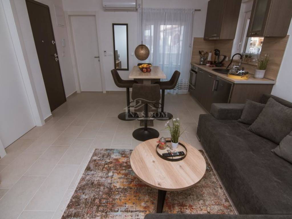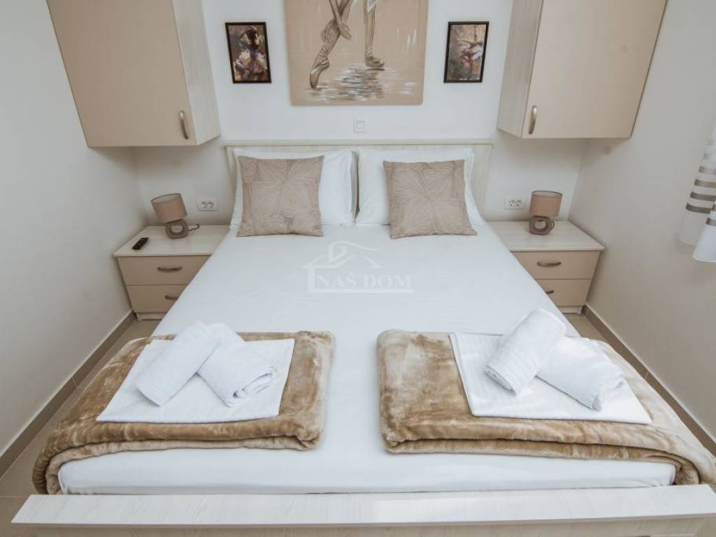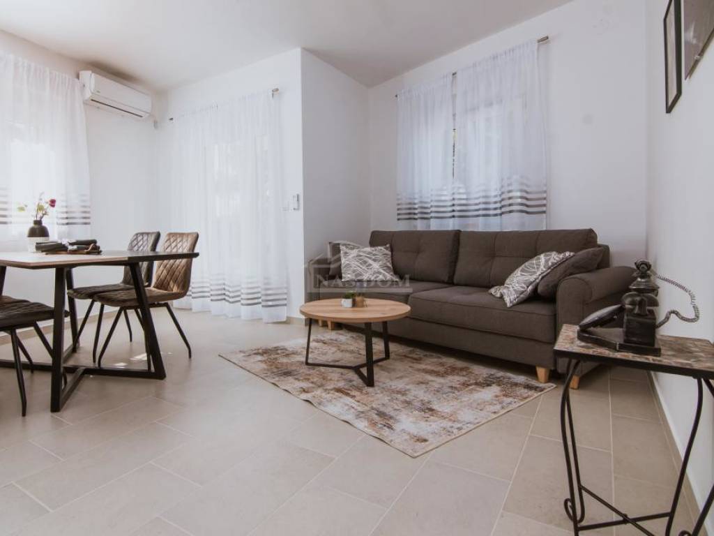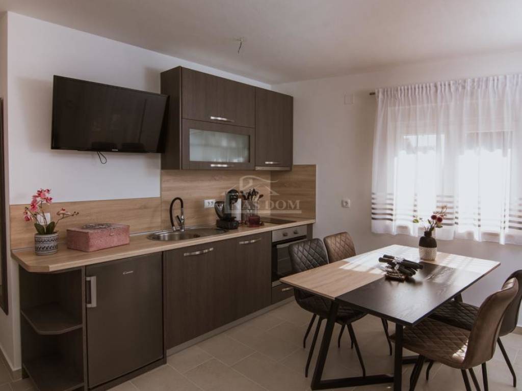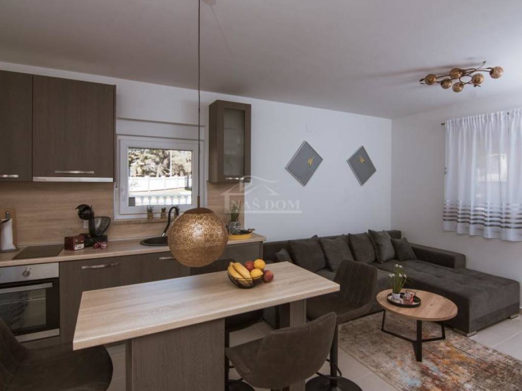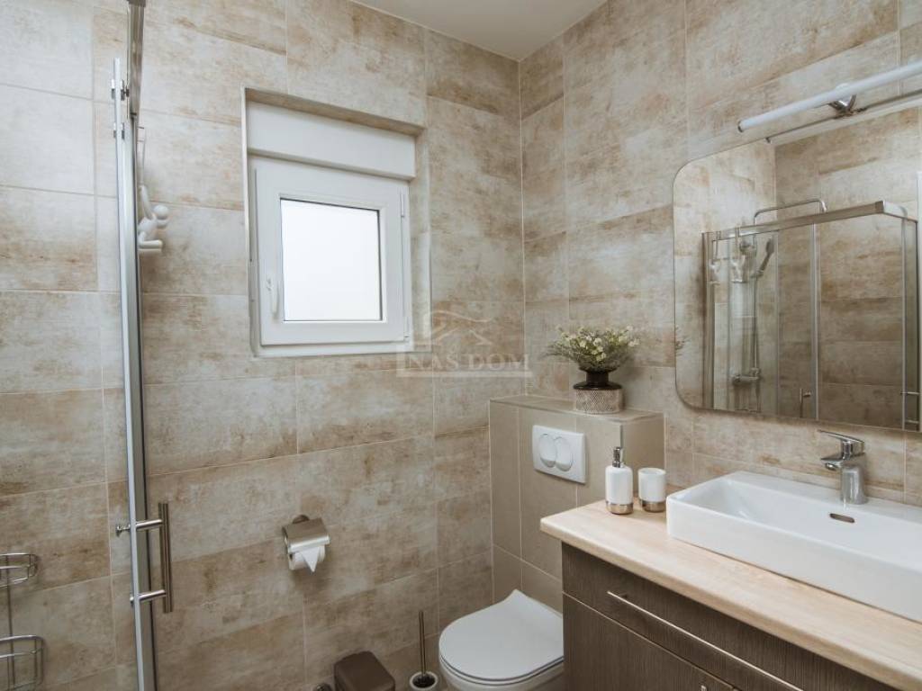 Vodice - for sale is a modern-looking detached house built in 2016. The house has a footprint of 97m2 and a total gross building area of 220m2, consisting of three levels: ground floor + upper floor + roof terrace. The house actually has a total of 4 apartments; two on the ground floor and two on the upper floor. All apartments consist of an entrance, a bedroom, a bathroom, a kitchen with a dining area, a living room, and a terrace. The apartments are air-conditioned and furnished with modern furniture.