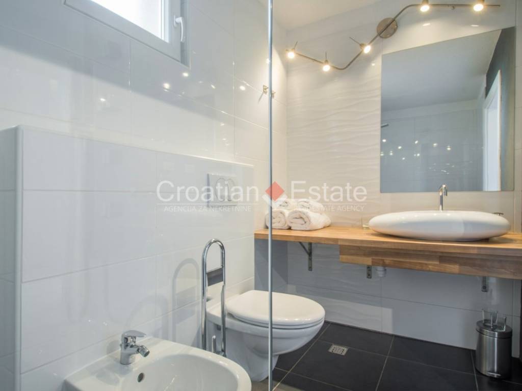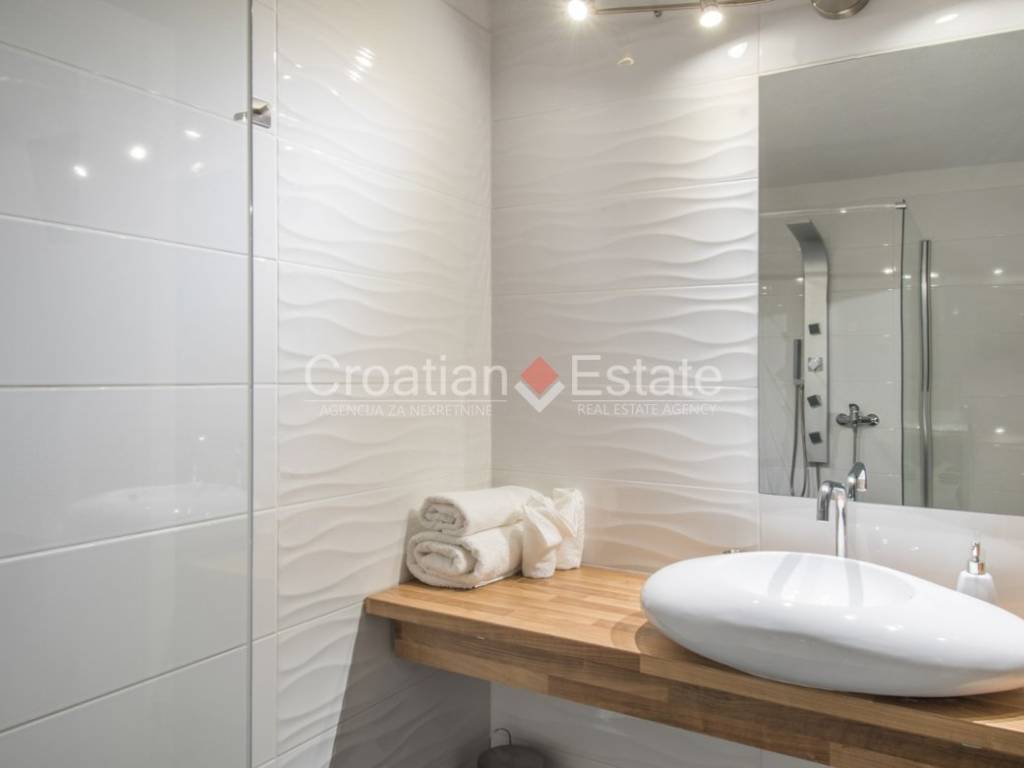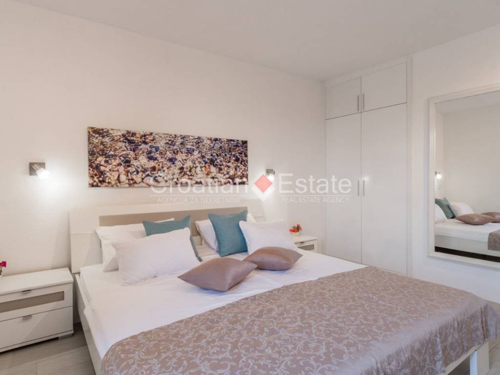 All rooms have air conditioners for heating and cooling. The house also has a solar panel system that allows energy savings, although it is connected to the town’s water and electricity supplies as well. All terraces and the area around the pool are paved with high-quality Brac stone. With four parking spaces, the villa can accommodate even a larger family. Every detail of this estate shows that everything has been considered – from functionality to aesthetics. It is sold fully furnished and equipped, move-in ready.