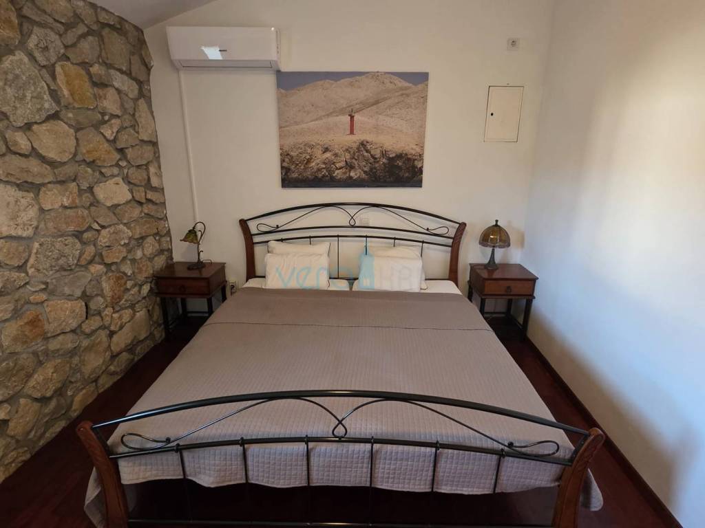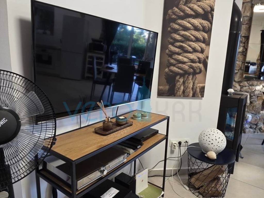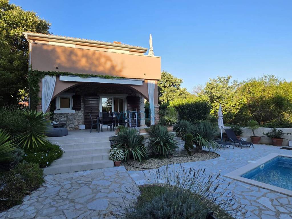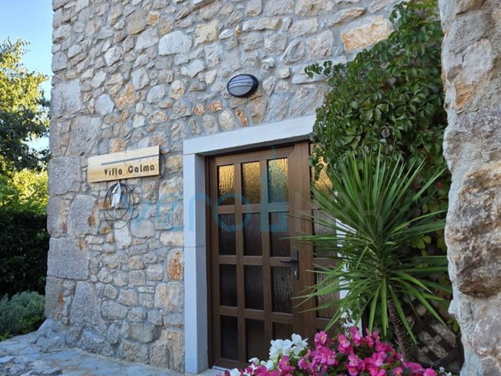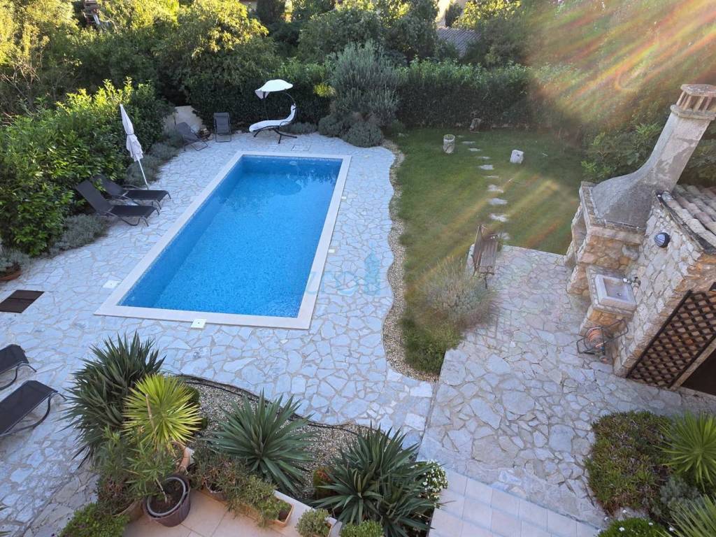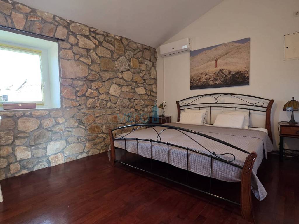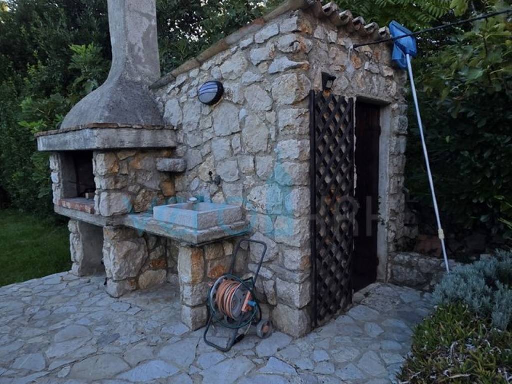 Island of Krk, Dobrinj, surroundings, stone house with a swimming pool, living area of 140 m2 with a yard of 355 m2. This detached house also holds the status of a cultural monument from the early 20th century, which is why the 2009 extension preserved antique features such as the stone facade on the east side of the house and stone details in the interior. The house was completely renovated in 2020, with attention to detail and is excellently maintained. In the fenced yard, arranged with flowers and Mediterranean herbs, there is a pool with a sunbathing area, a barbecue with storage, a covered terrace, and parking space for two cars with access to the house. On the ground floor of the house, there is a bathroom with a shower, a kitchen with a dining area and living room with access to the terrace, and a staircase leading to the upper floor. There are two bedrooms, a spacious bathroom with a bathtub, and a balcony with a view of the surroundings. Heating and cooling are provided by air conditioning units and a wood-burning fireplace, and all furniture and equipment are included in the price. The house is located 4200 m from the sea in a cul-de-sac of a settlement near Dobrinj, surrounded by forest and family houses, making it an ideal property for vacation.